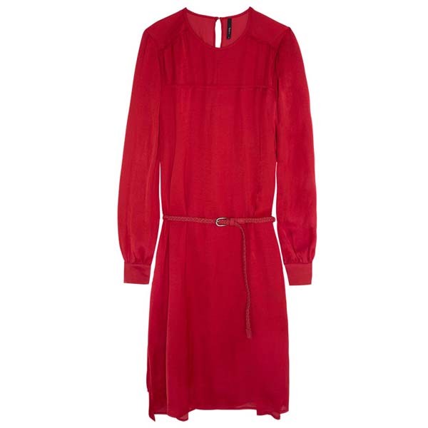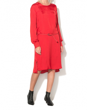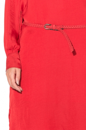 Vestito girocollo, manica lunga, bottoncini sul fondo manica, spacchi laterali, più lungo sul retro, ampia apertura sul retro, cintura intrecciata in vita, rosso scuro, foderato.