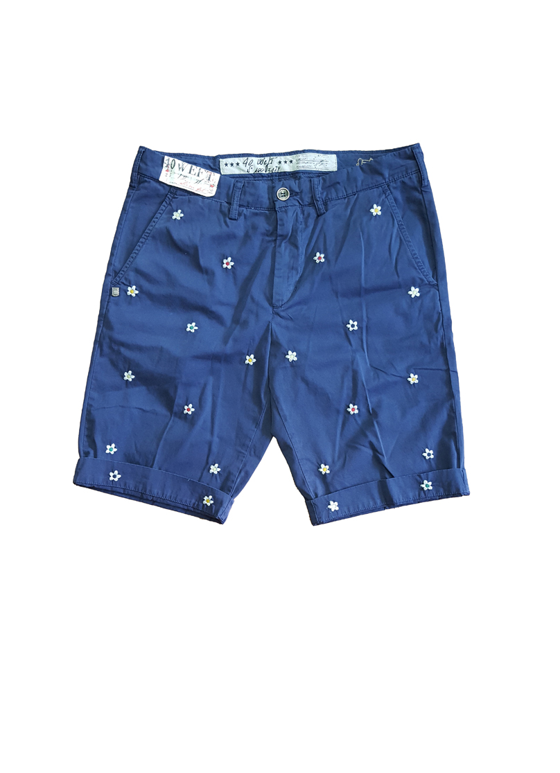 Bermuda blu, fantasia con fiorellini cuciti, tasche a filo, chiusura tramite zip e bottone.