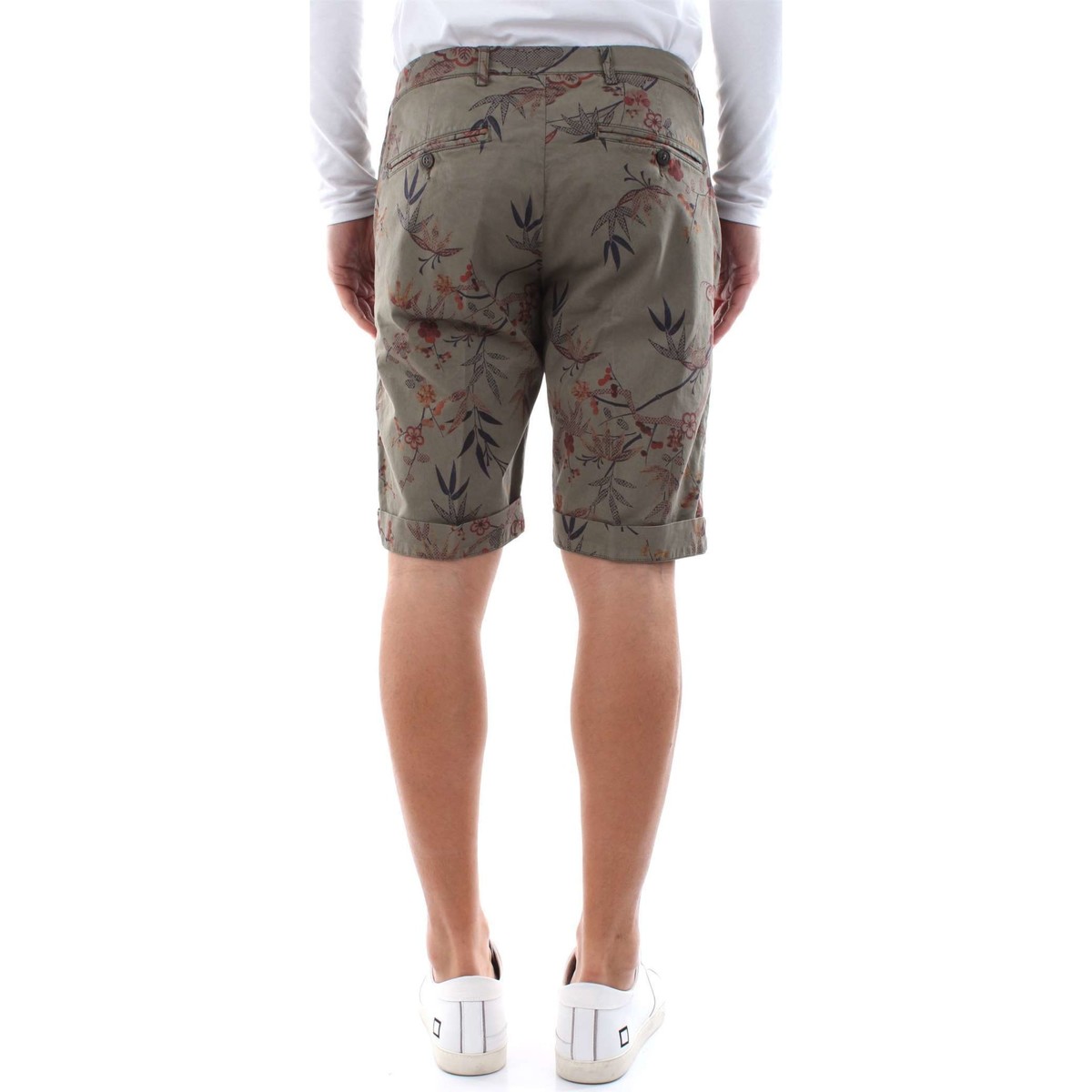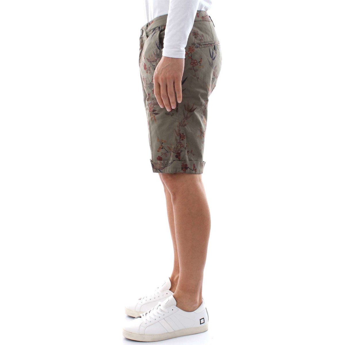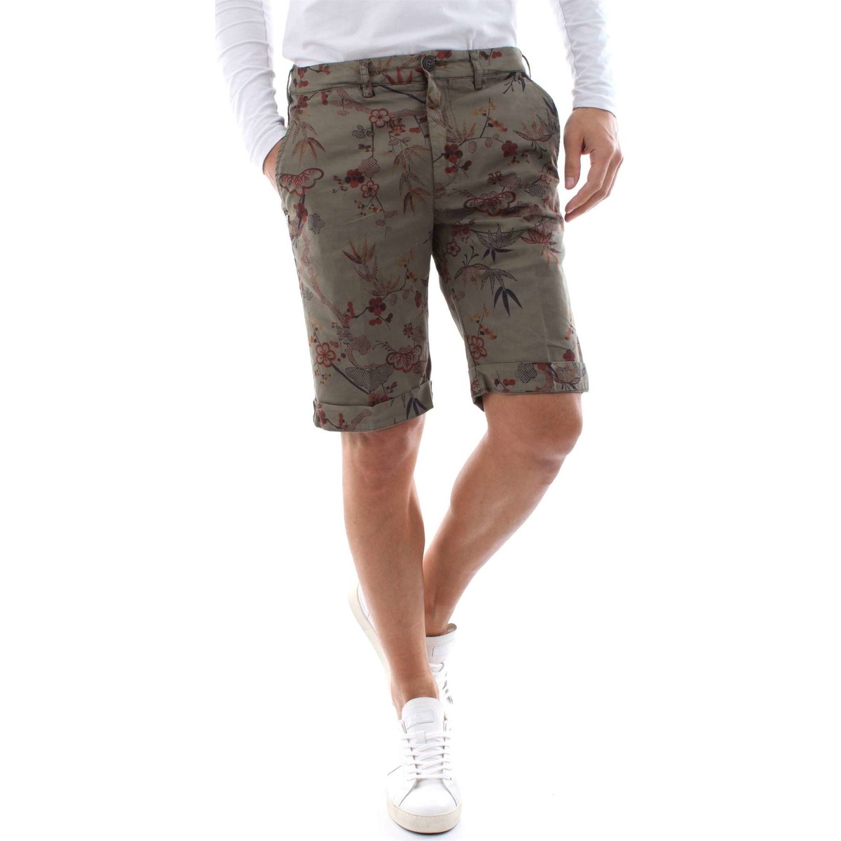 Bermuda tasche a filo, chiusura centrale tramite zip e bottone, tasche a filo sul retro con chiusura tramite bottone, verde militare interamente stampato con motivo floreale.