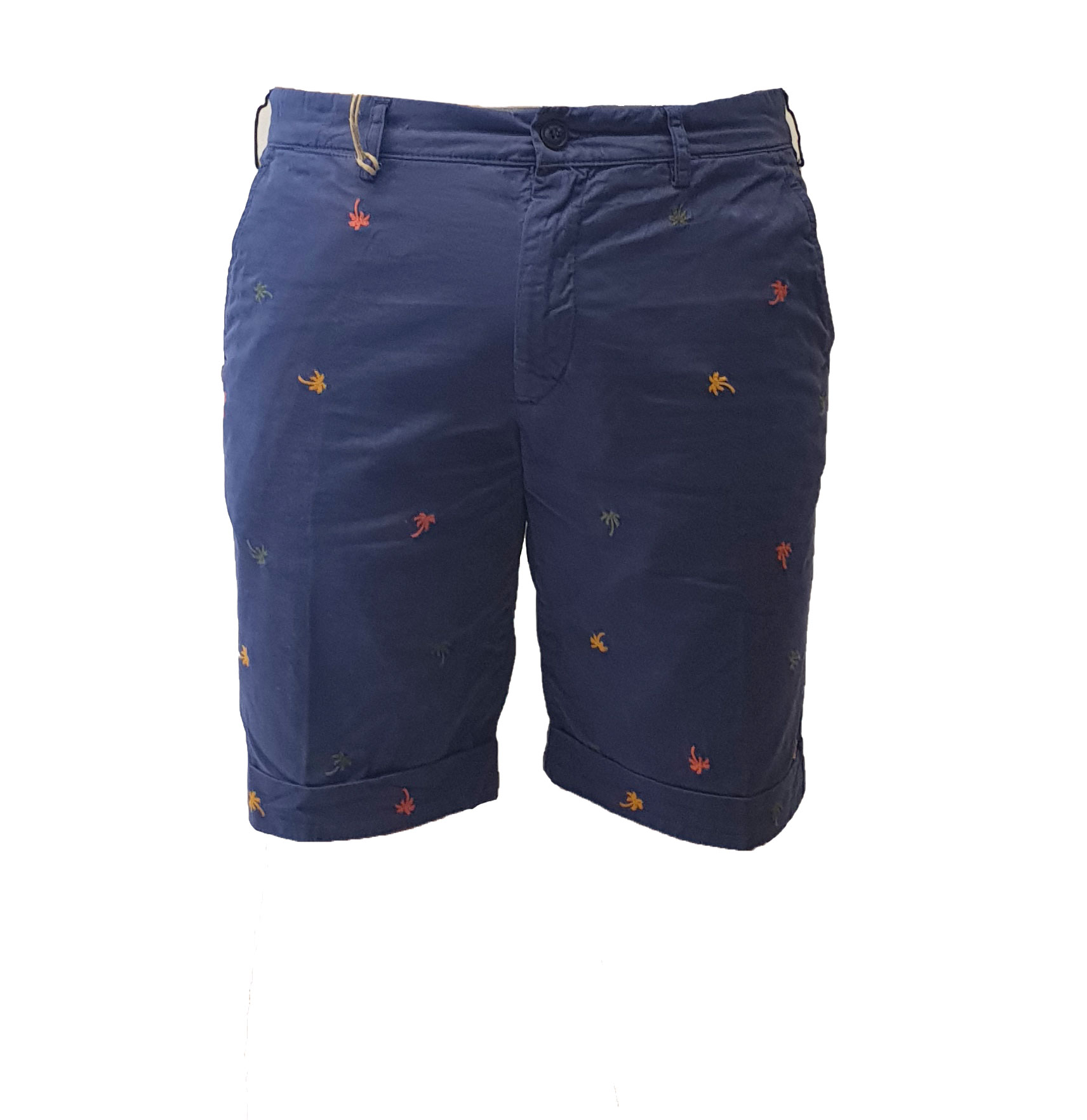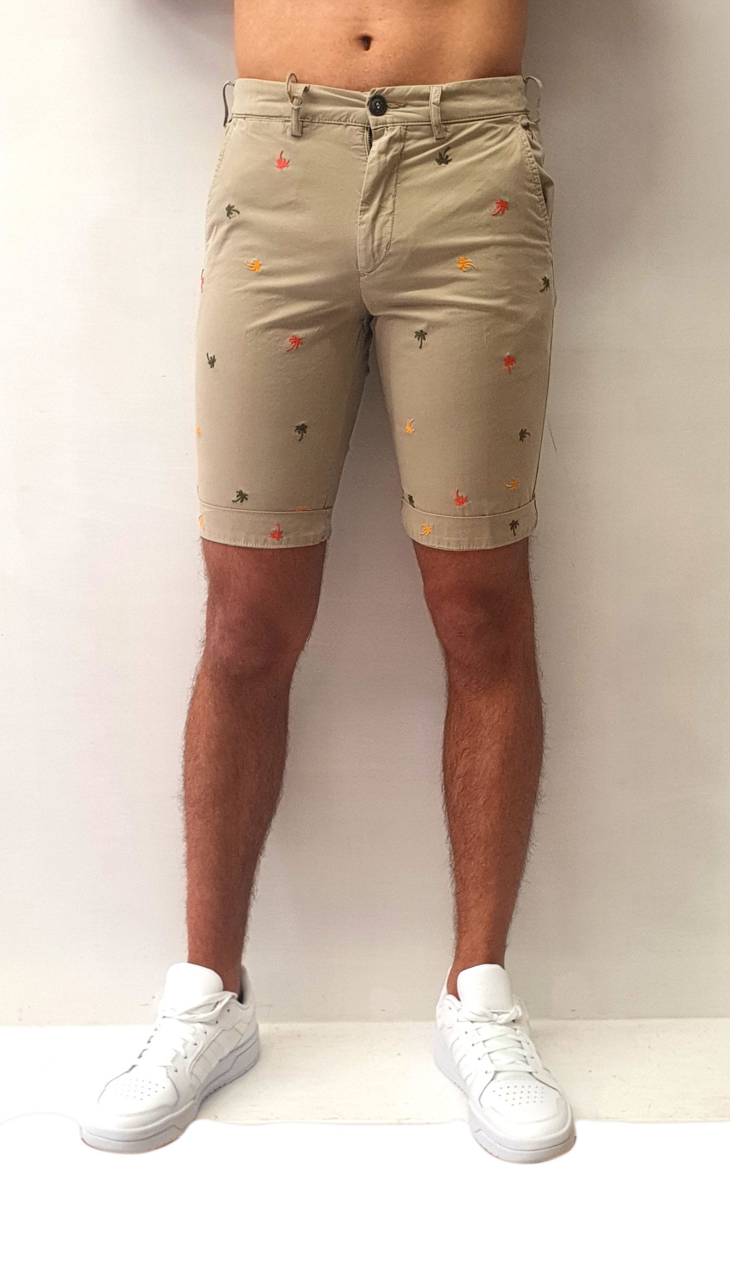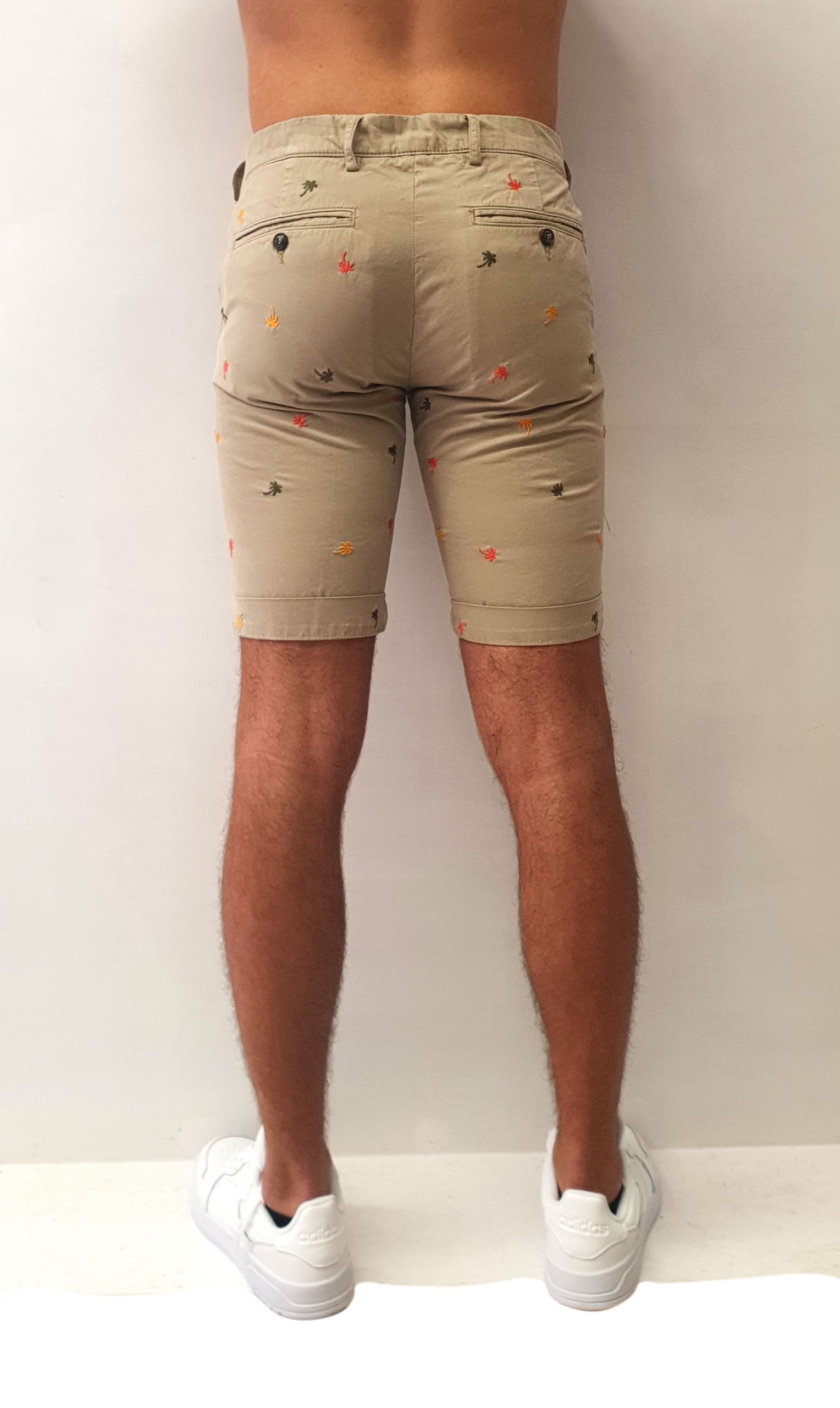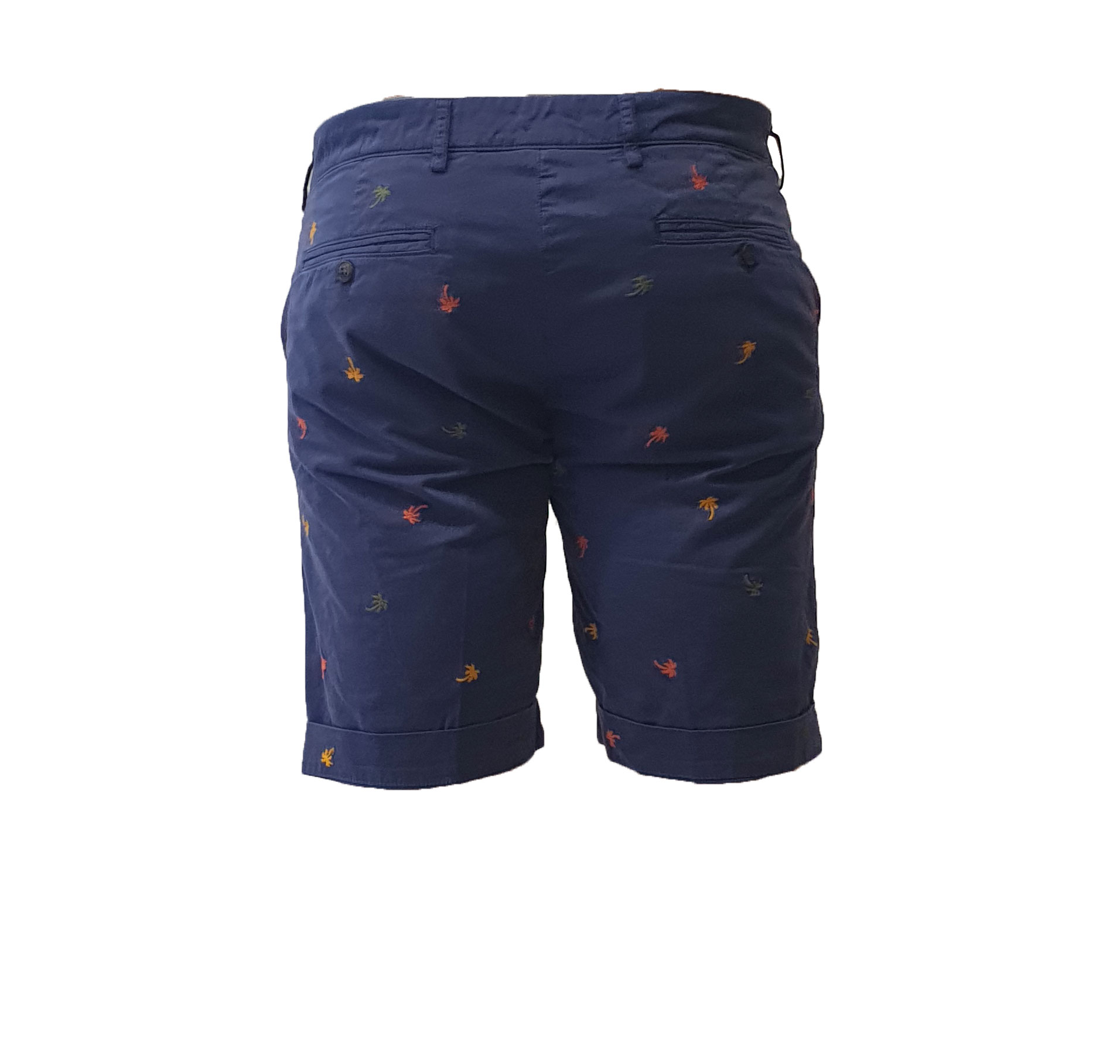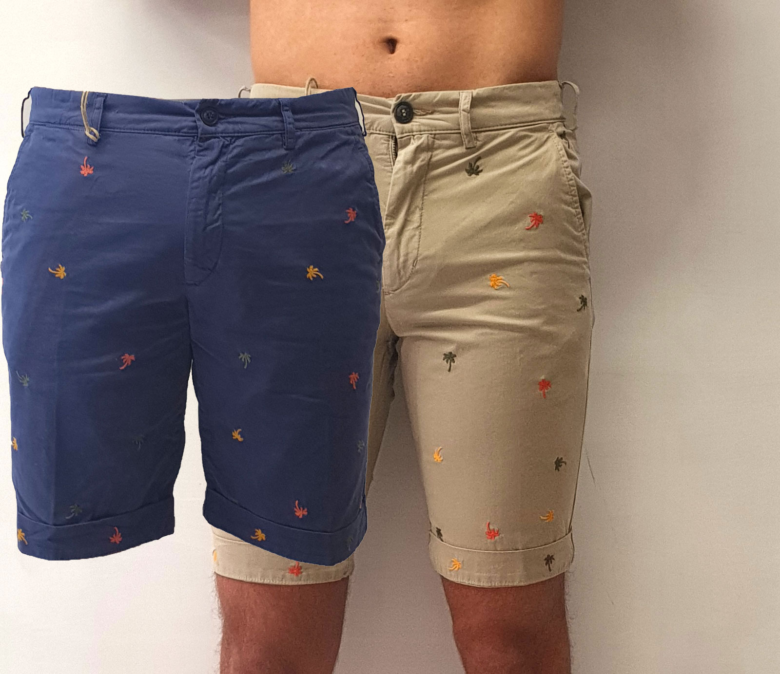 Bermuda tinta unita con ricami a contrasto colorati, tasche a filo laterali e sul retro con chiusura tramite bottone, chiusura centrale tramite zip e bottone, disponibile in due varianti di colore blu e beige.