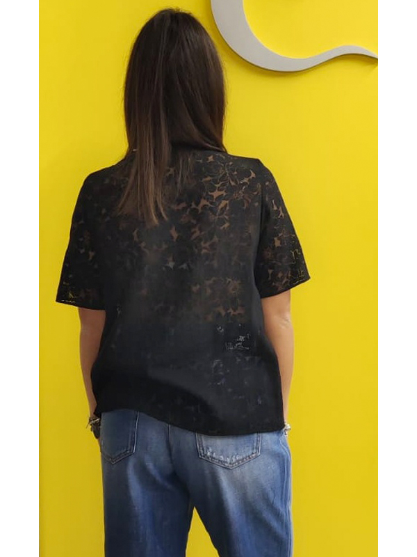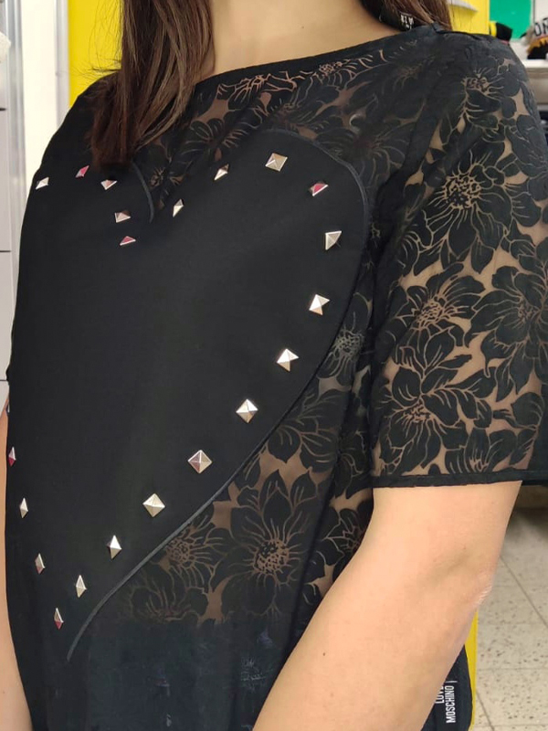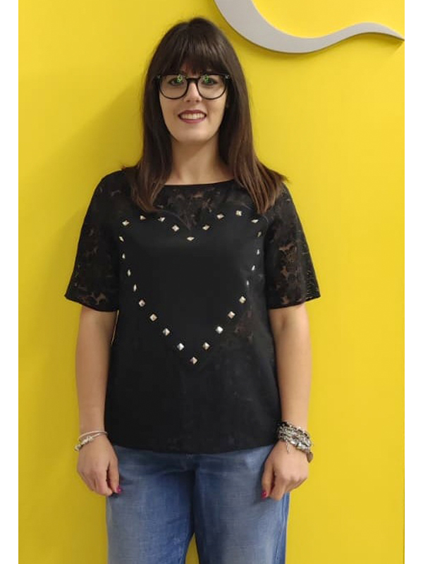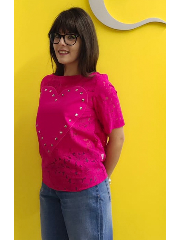 Blusa manica corta, girocollo, disponibile in due varianti di colore nero e fucsia, ricamata con trasparenze, cuore sul davanti con applicazione di borchie.