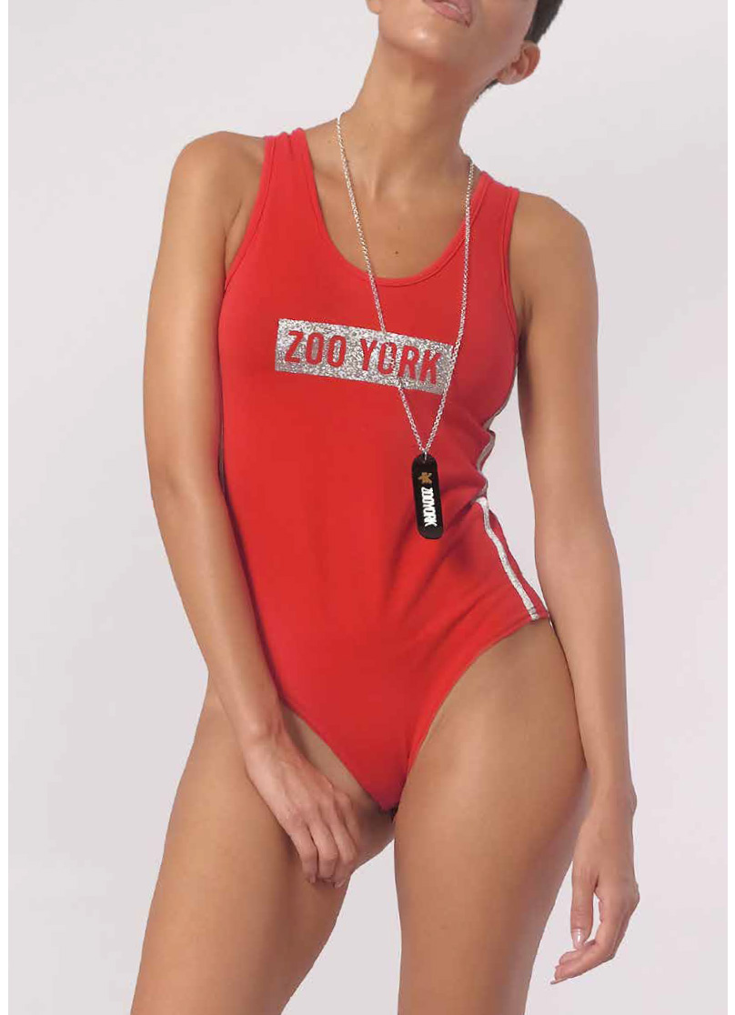 Body smanicato, girocollo, bande lungo i lati glitterate, logo glitterato sul petto, disponibile in diverse varianti di colore. Made in Italy.