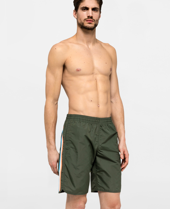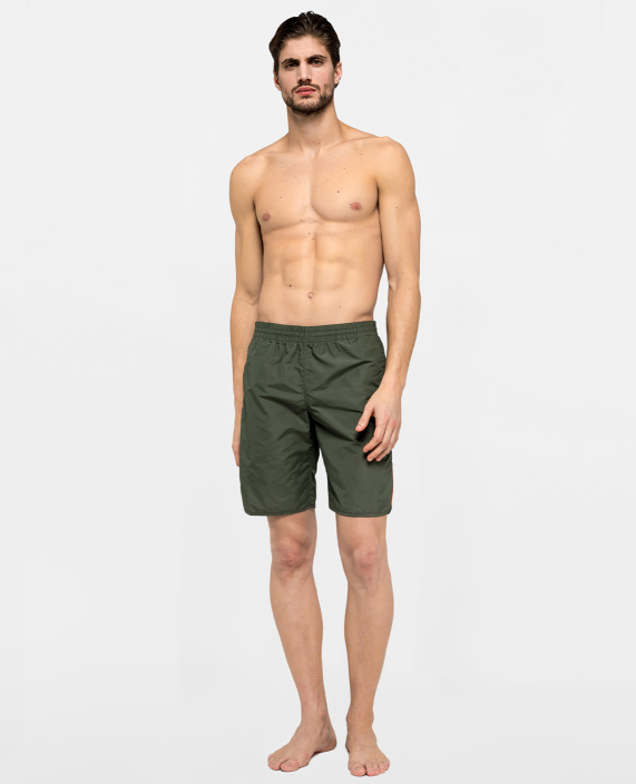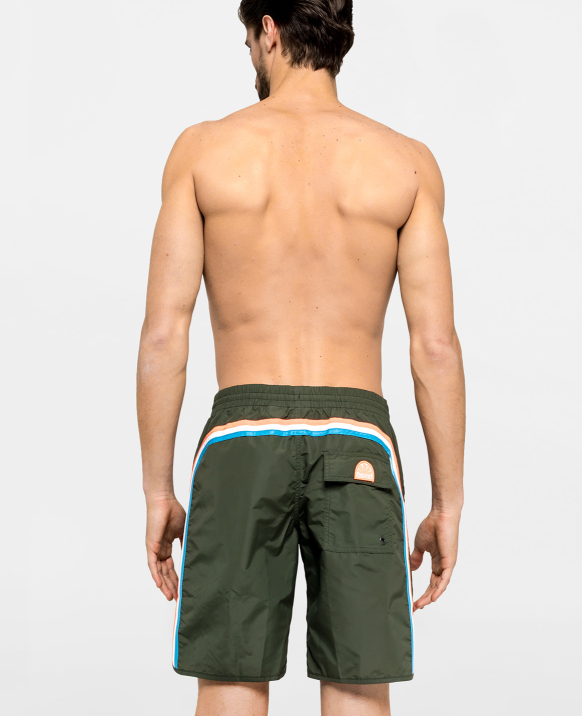 Pantaloncino mare lungo, con elastico in vita regolabile tramite lacci, tinta unita verde militare con arcobaleno sul retro a contrasto, tasche a filo laterali, taschino sul retro con chiusura tramite velcro e patch applicata logo sundek, slip interno in rete.