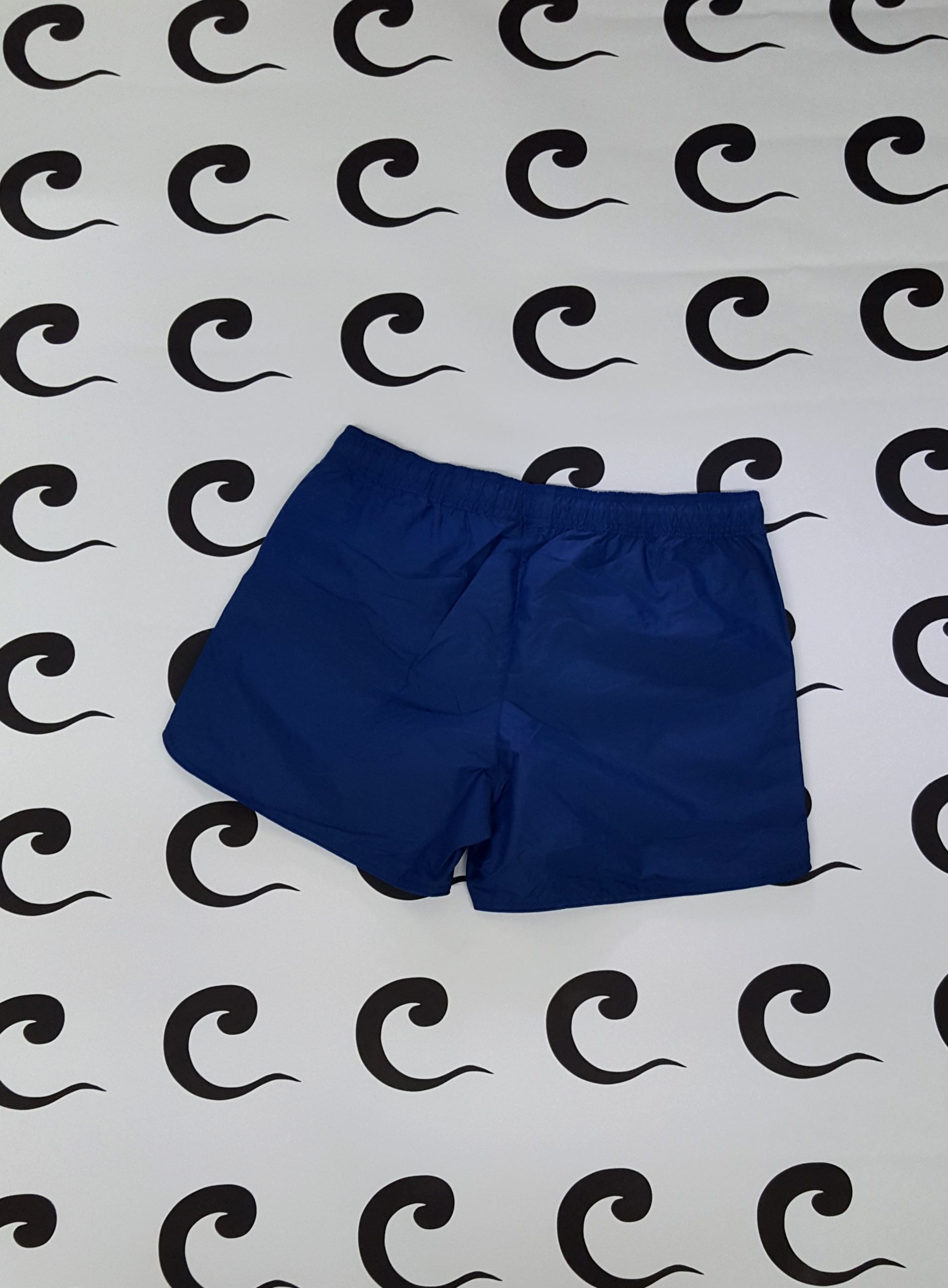 Costume da mare blu a pantaloncino, elastico in vita regolabile tramite laccio, tasche laterali a filo, logo cucito sul fondo.