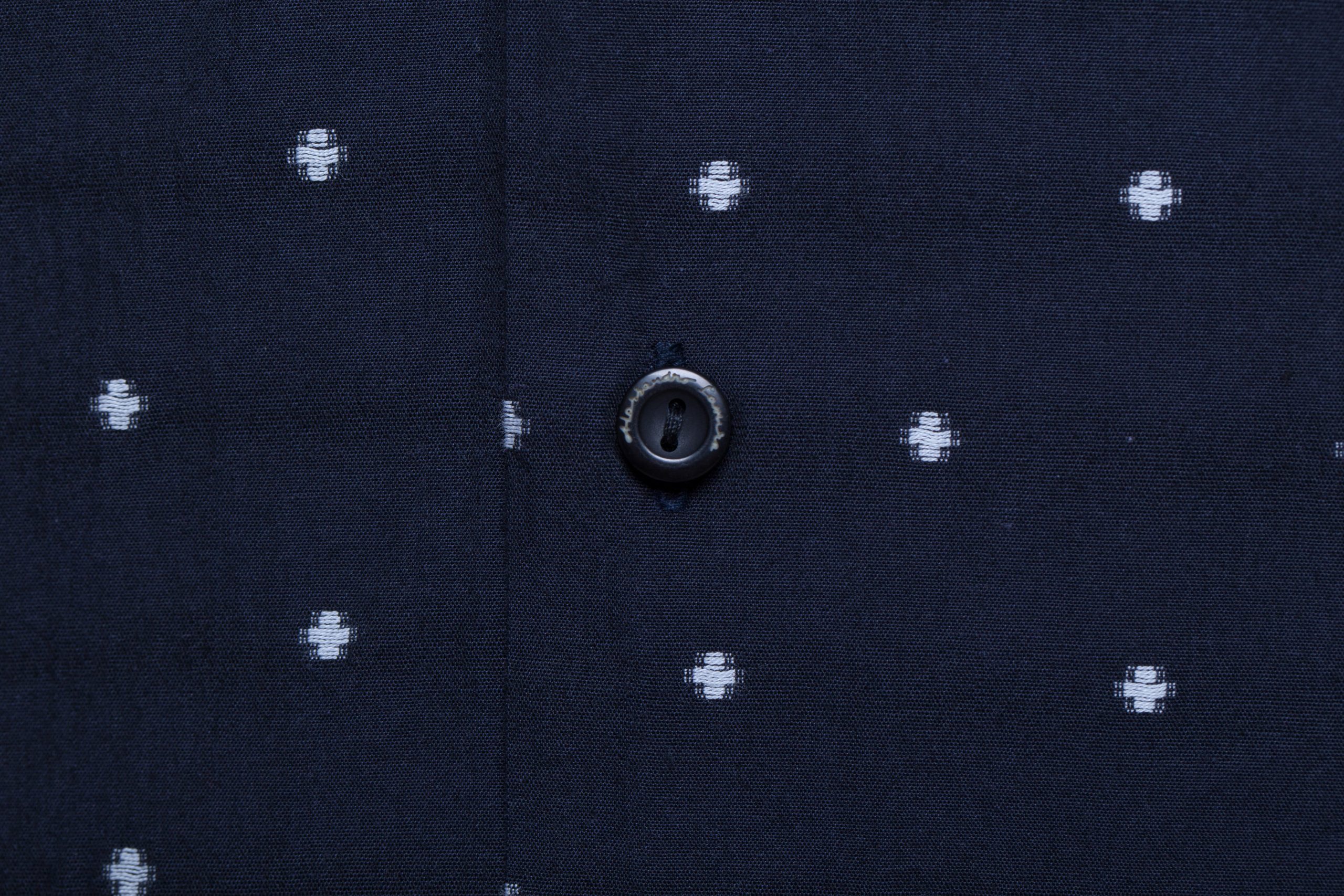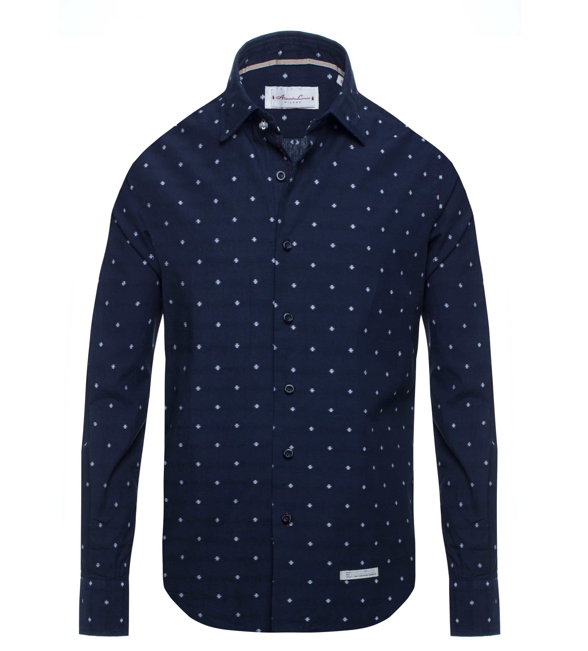 Camicia manica lunga, colletto classico, chiusura centrale tramite bottoni logati, blu con micro fantasia ricamata a contrasto, slim fit.