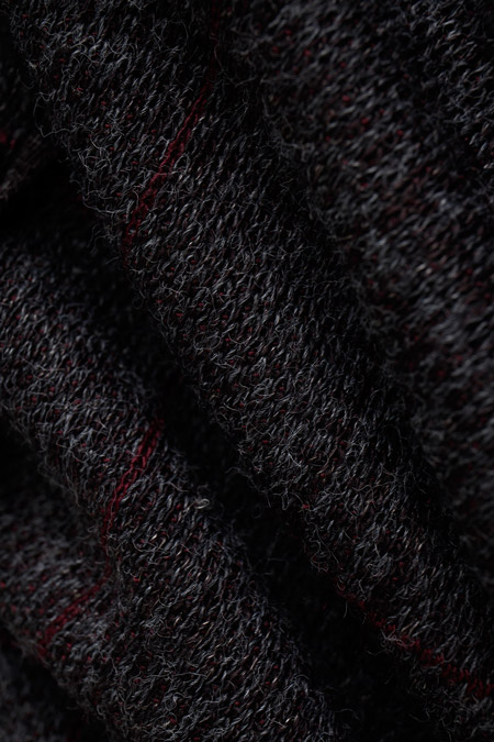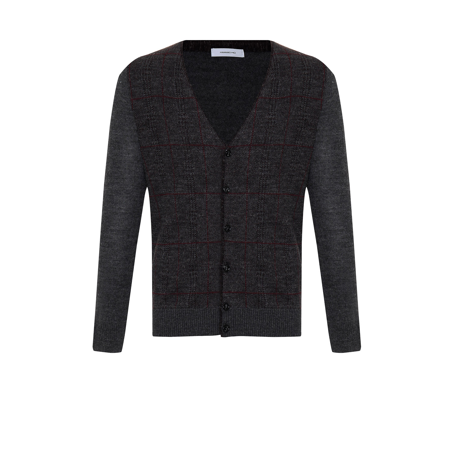 Giacca chiusura centrale tramite bottoni, grigio con quadri bordeaux, manica lunga, orlo polsini e fondo elasticizzati.