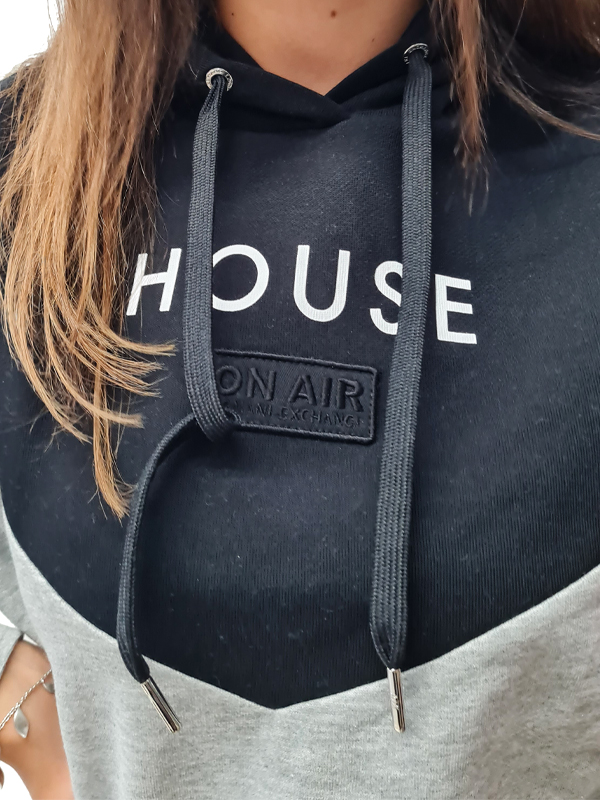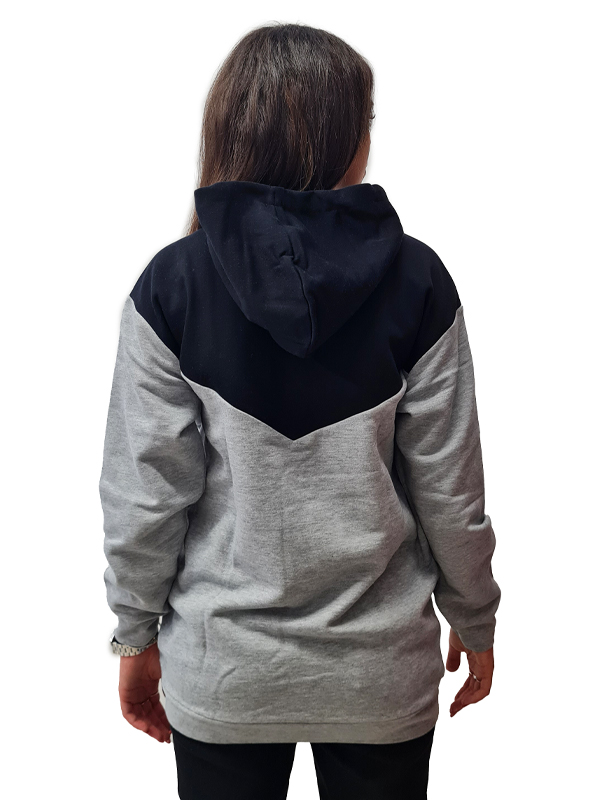 Maglia manica lunga felpata, cappuccio regolabile tramite lacci, polsini e fondo elasticizzati a costine, patch applicata sul davanti.