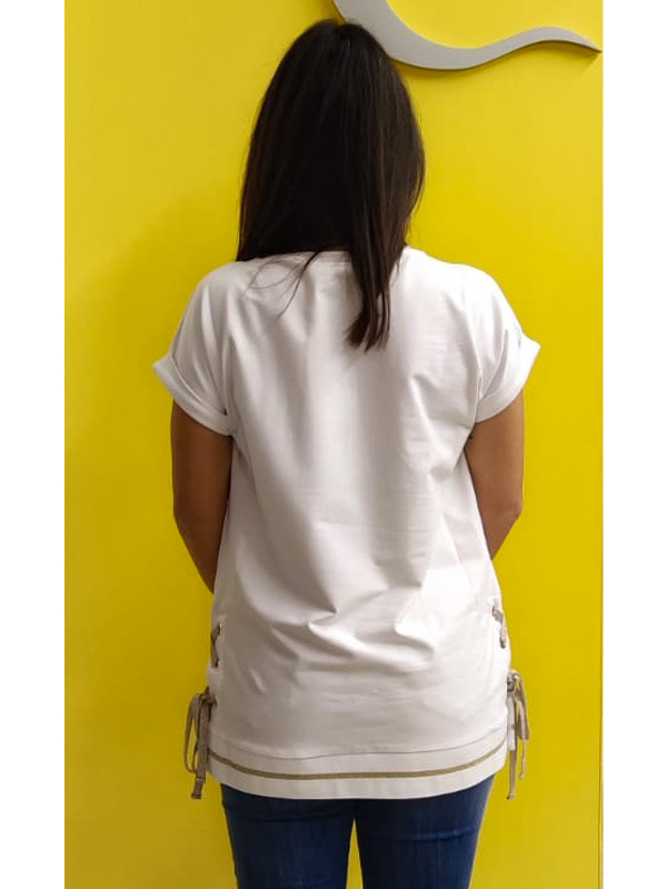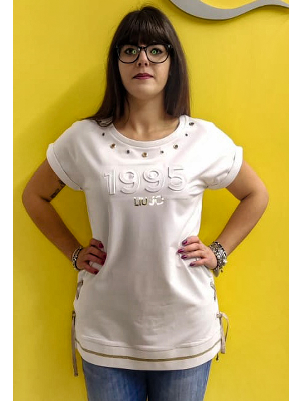 Felpa manica corta, girocollo, borchie applicate intorno al collo, aperture laterali con chiusura tramite lacci a contrasto, fondo elasticizzato a costine, logo stampato sul davanti.