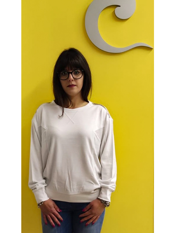Felpa manica lunga, girocollo, applicazioni sulle spalle, bianca, polsini e fondo elasticizzati a costine, logo metallico cucito sul davanti.