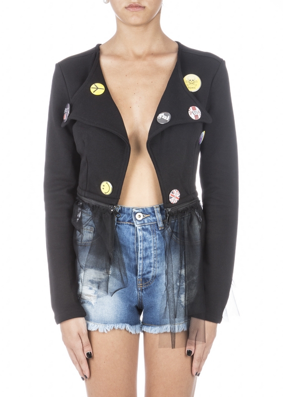 Giacca manica lunga, senza chiusura, cerniera con tulle sul fondo removibile, spille colorate. Made in Italy.