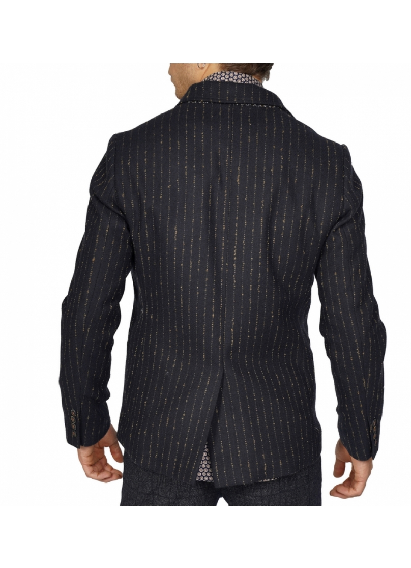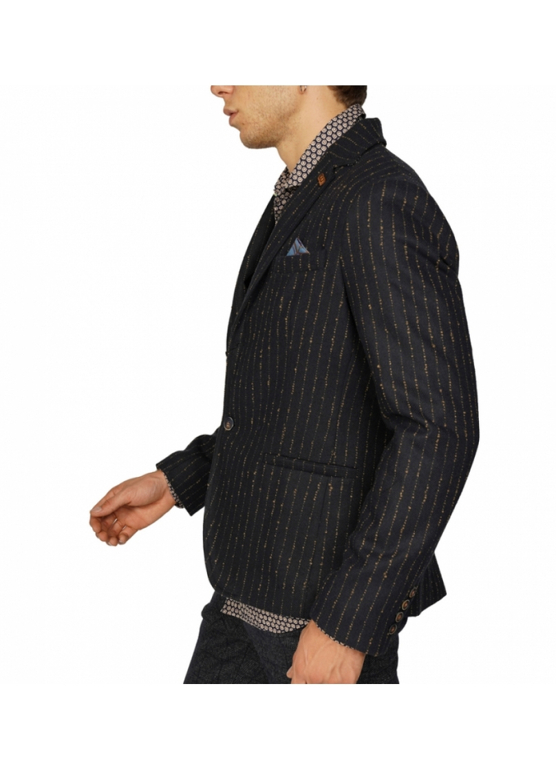 Giacca con collo classico, chiusura centrale tramite bottoni centrali, bottoni sul fondo manica, finte tasche frontali, taschino sul petto, blu con motivo righe ricamate a contrasto. Made in Italy.