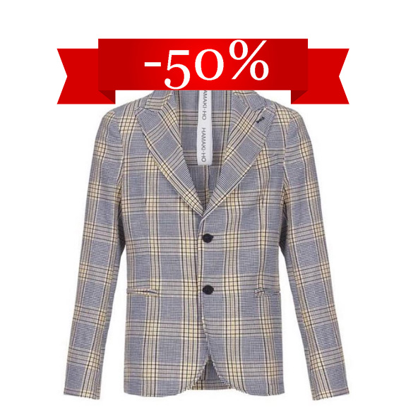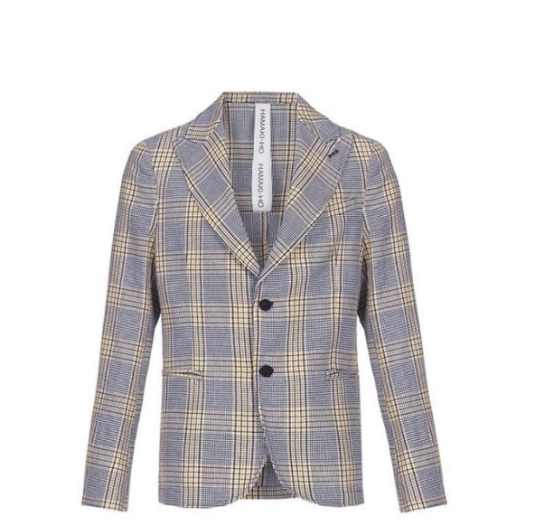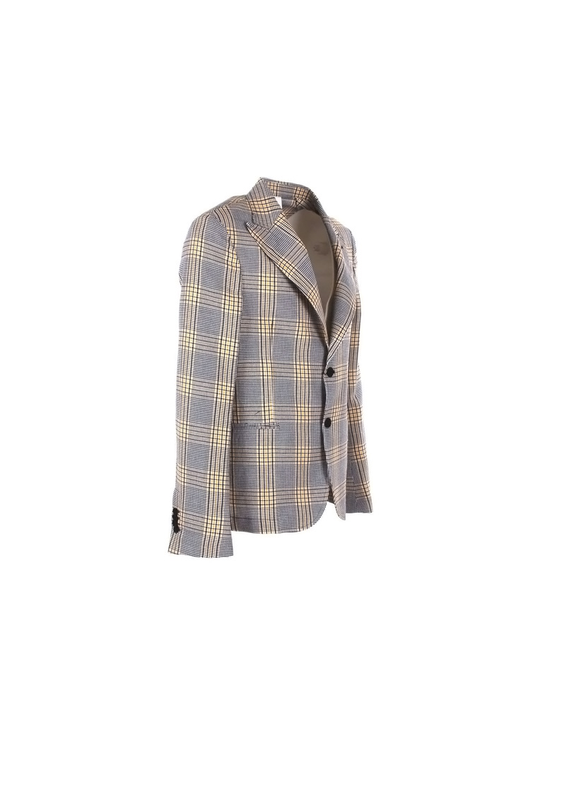 Giacca fantasia quadri, blu e gialla, revers classico, tasche a filo sul davanti, bottoni sul fondo manica, taschino a filo sul petto,regular fit, taschini interni.