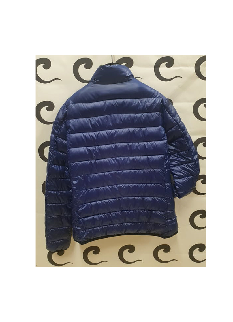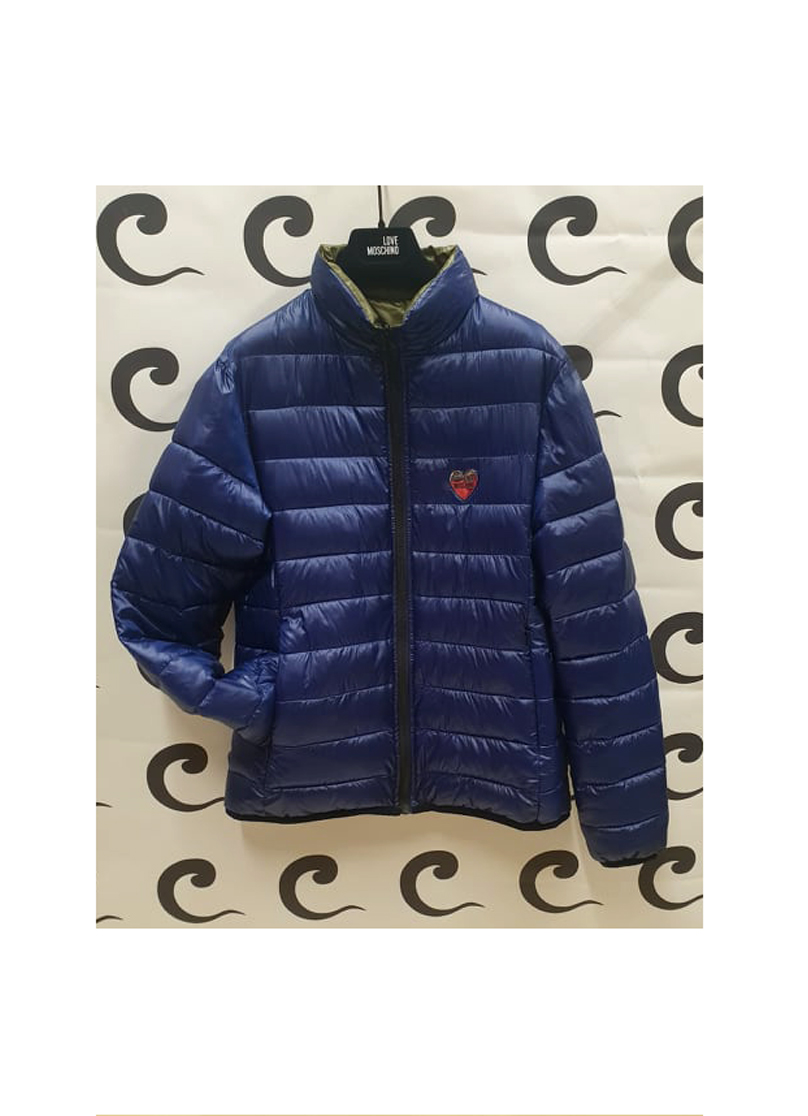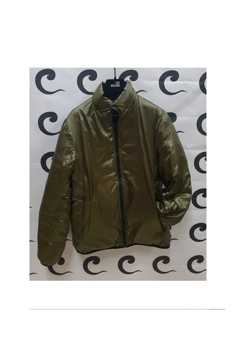 Piumino reversibile, da un lato blu lucido trapuntato, con logo in metallo applicato sul petto, dall’altro lato verde militare lucido con scritta stampata a contrasto sul retro, tasche laterali a filo con chiusura tramite zip, chiusura centrale tramite zip, colletto alto.