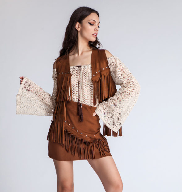 Gonna corta, scamosciata, marrone con frange e borchie sul davanti, chiusura sul retro tramite zip. Made in Italy.