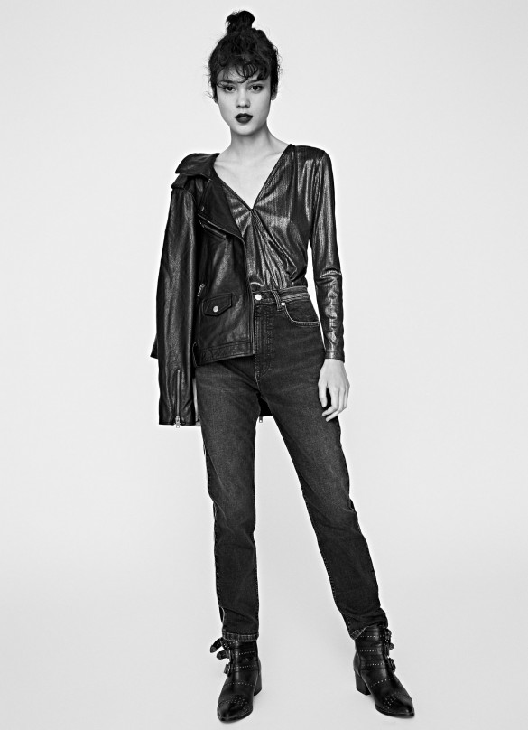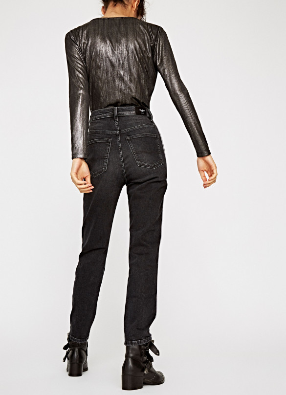 Jeans cinque tasche, vestibilità oversize, vita alta, lavaggio nero, stile retro, effetto usurato, gamba a sigaretta. Lunghezza: 28.
