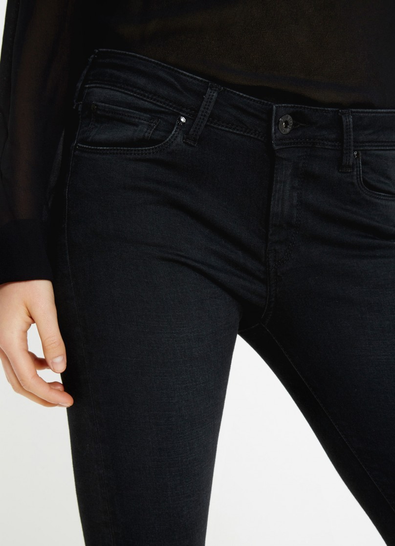 Jeans cinque tasche, nero, skinny fit, effetto stretch, chiusura centrale tramite zip e bottone.