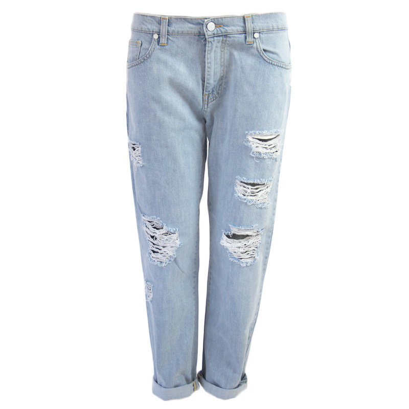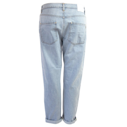 Jeans lavaggio chiaro, pochi strappi sul davanti, cavallo basso, modello capri. Made in Italy.