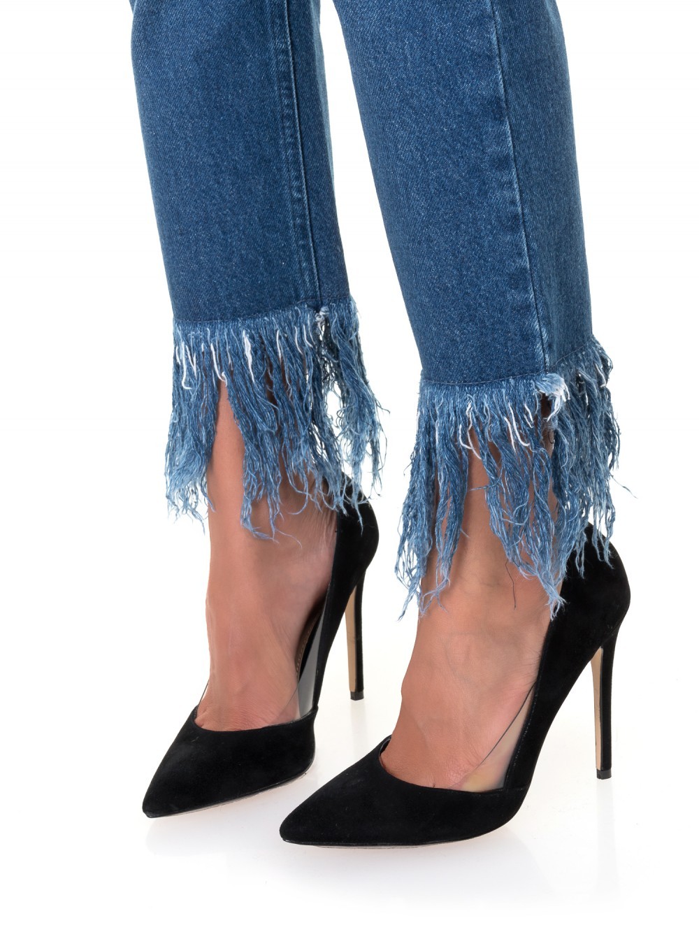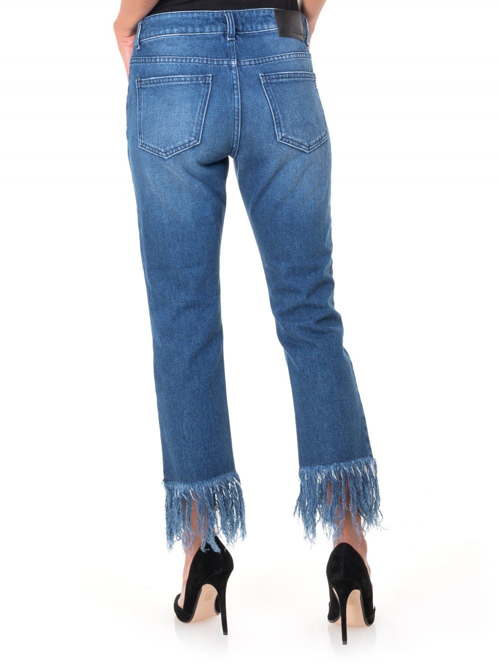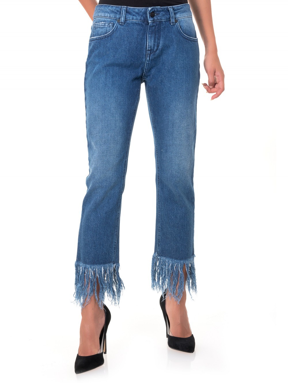 Jeans a zampa, cinque tasche, sfilacciato sul fondo, chiusura centrale tramite zip e bottone.