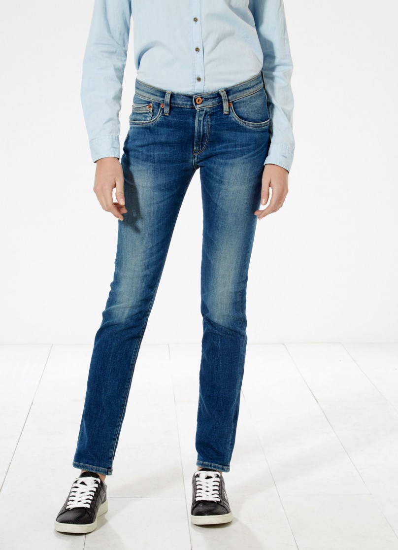 Jeans Lavaggio medio e effetto consumato . Tasche a filetto . Perfetto per questa stagione .