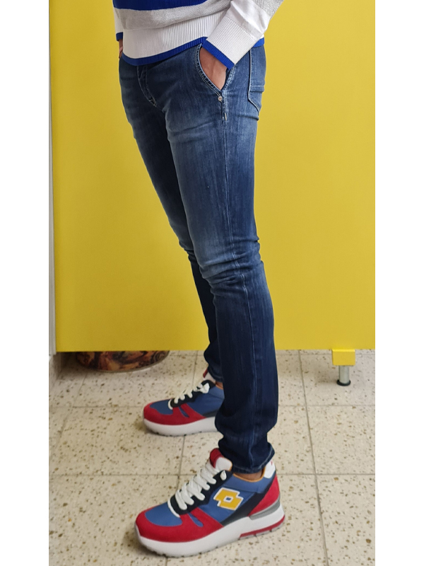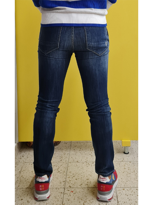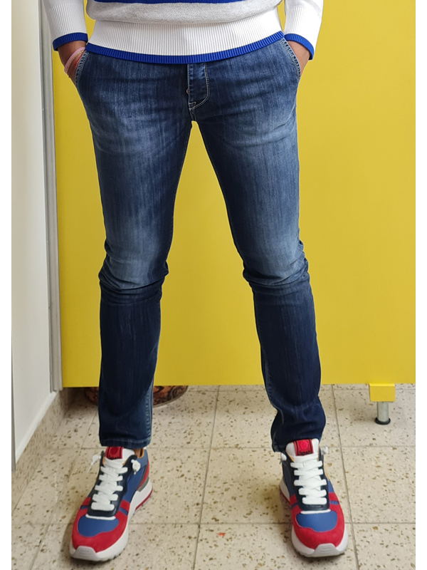Jeans skinny fit, lavaggio scuro, tasche laterali a filo, chiusura centrale tramite bottoni. Made in Italy.