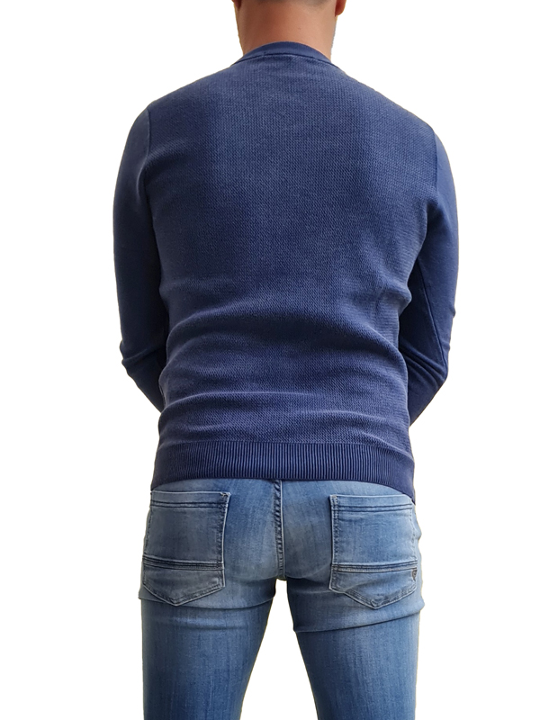 Maglia manica lunga in filato di cotone lavato, interamente in maglia lavorata, rifiniture elasticizzate a costine, logo metallico cucito sul petto.