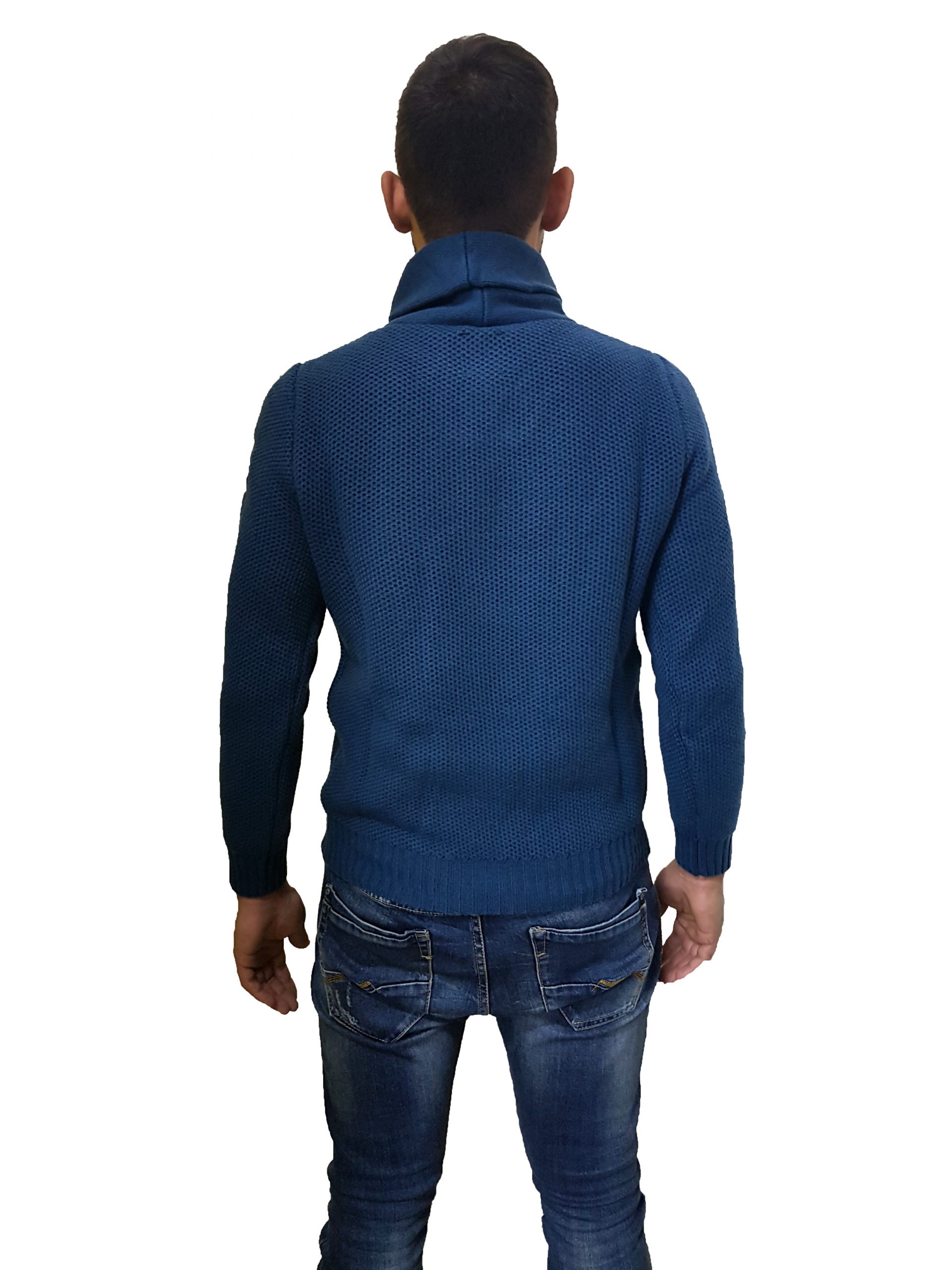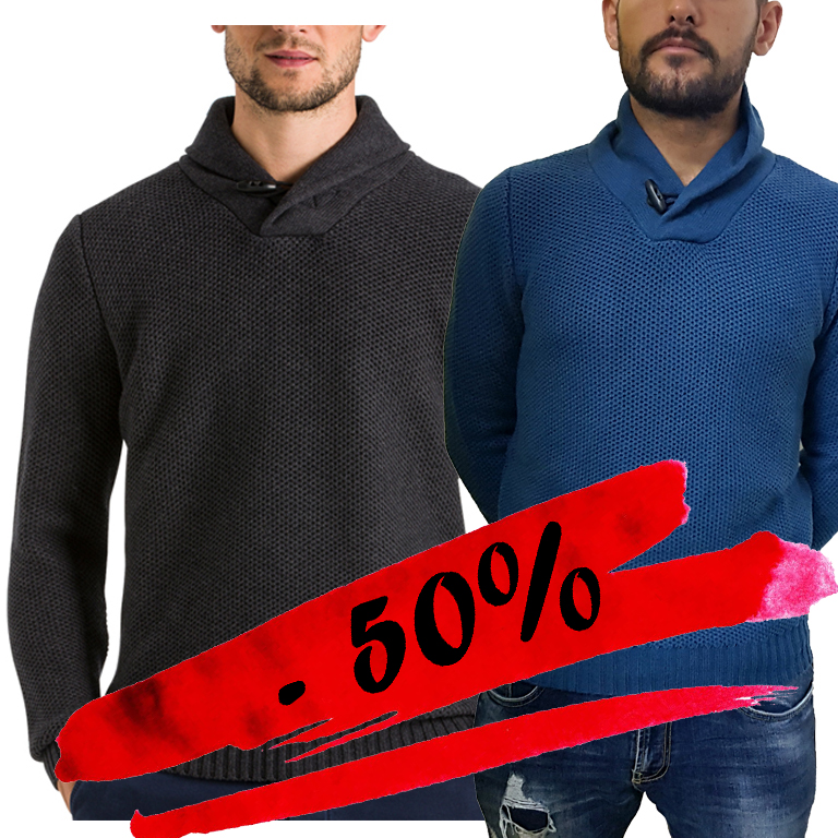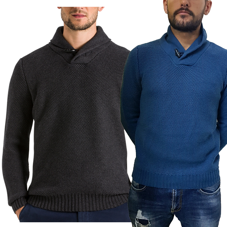 Maglione sciallato a maglia intrecciata, alamaro sul collo, disponibile in due varianti di colore blu petrolio o grigio scuro, polsini e fondo elasticizzati a coste.