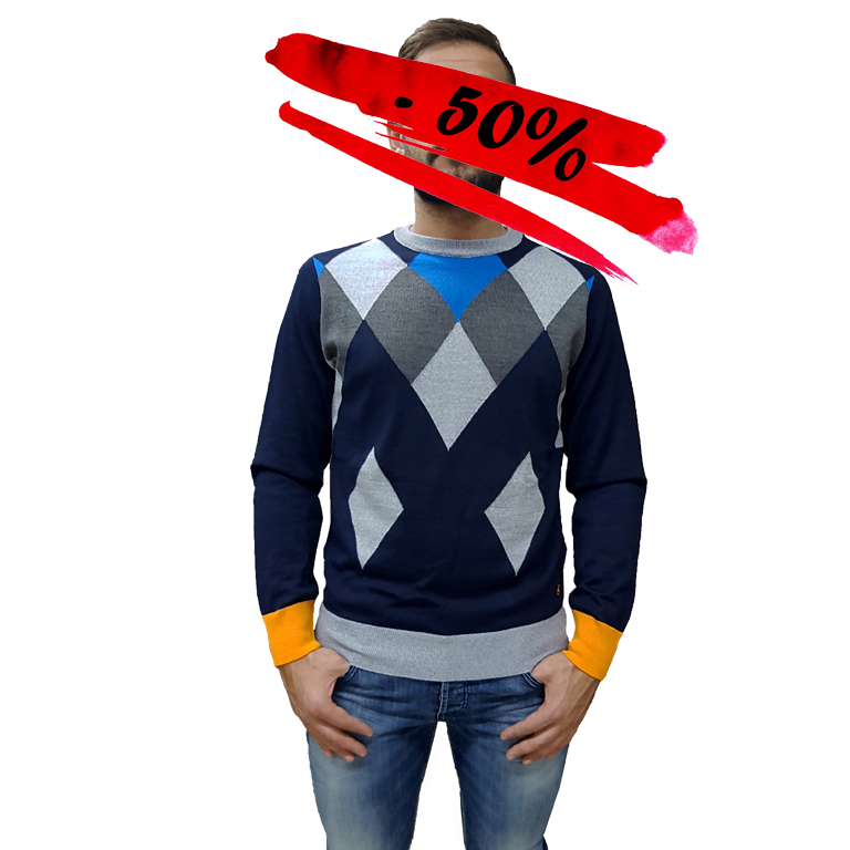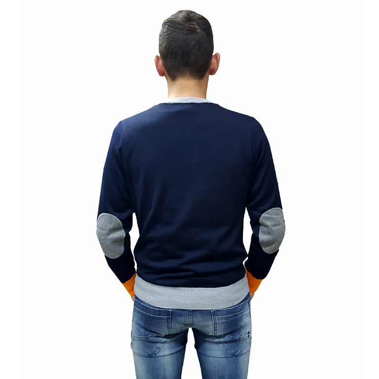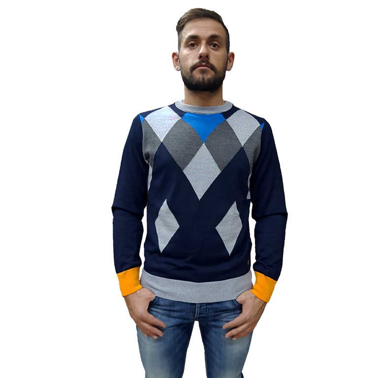 Maglia manica lunga, girocollo, misto lana rasata, fantasia quadri di vario colore sul davanti, collo polsini e fondo elasticizzati a contrasto, toppe sui gomiti a contrasto, logo ricamato sul fondo.