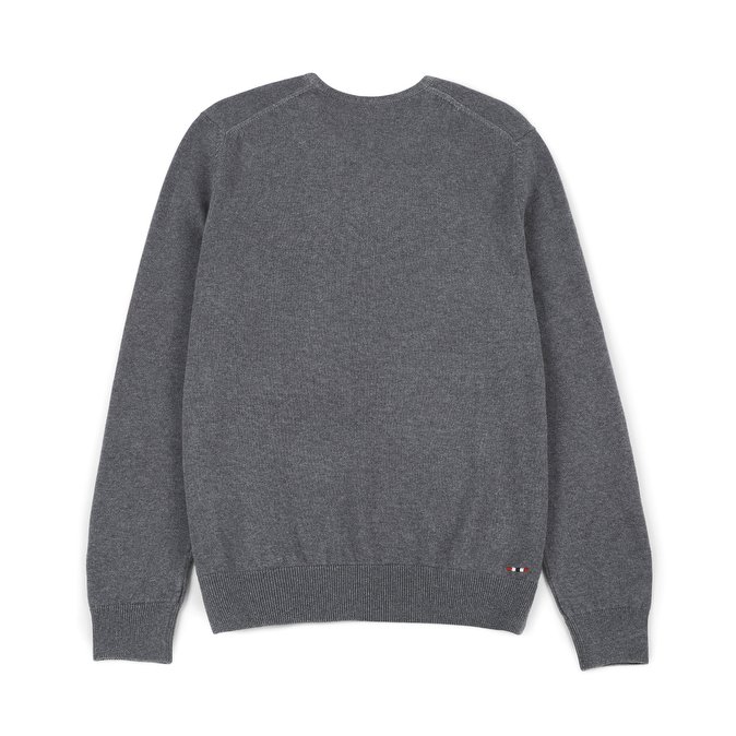 Maglia girocollo, manica lunga, bordi a coste, disponibile in due varianti di colore grigio scuro e rosso brillante, logo cucito a contrasto sul petto, dettagli elementi grafici.