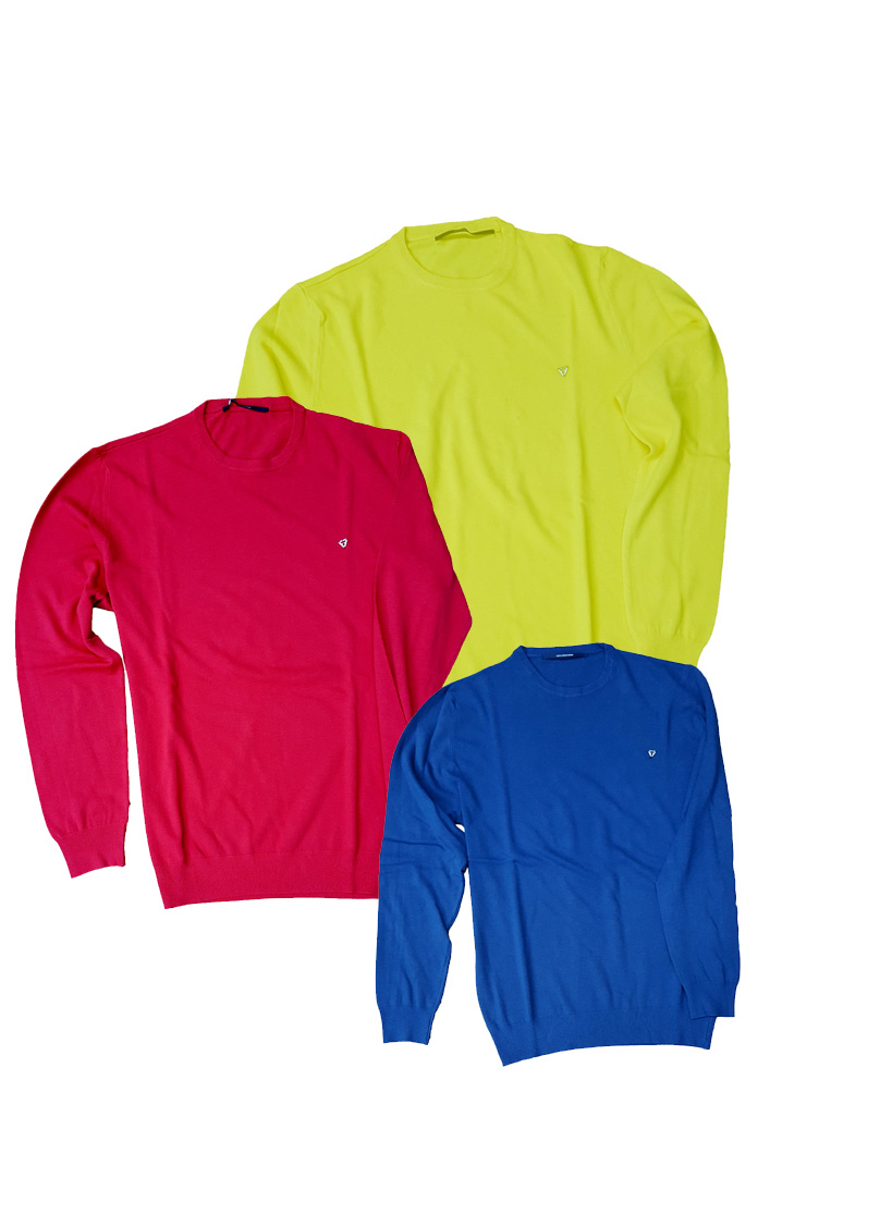 Maglia manica lunga, girocollo, bielastico, disponibile in tre varianti di colore blu, giallo o rosso.
