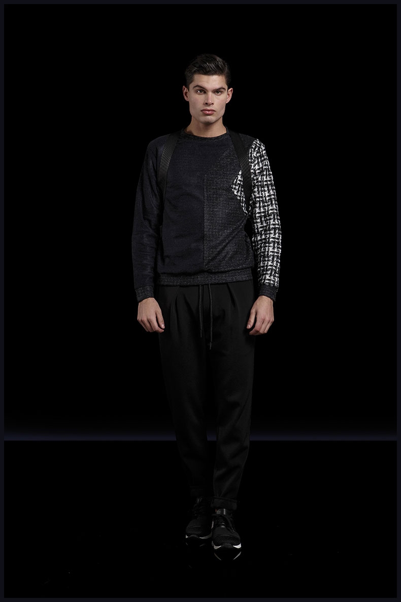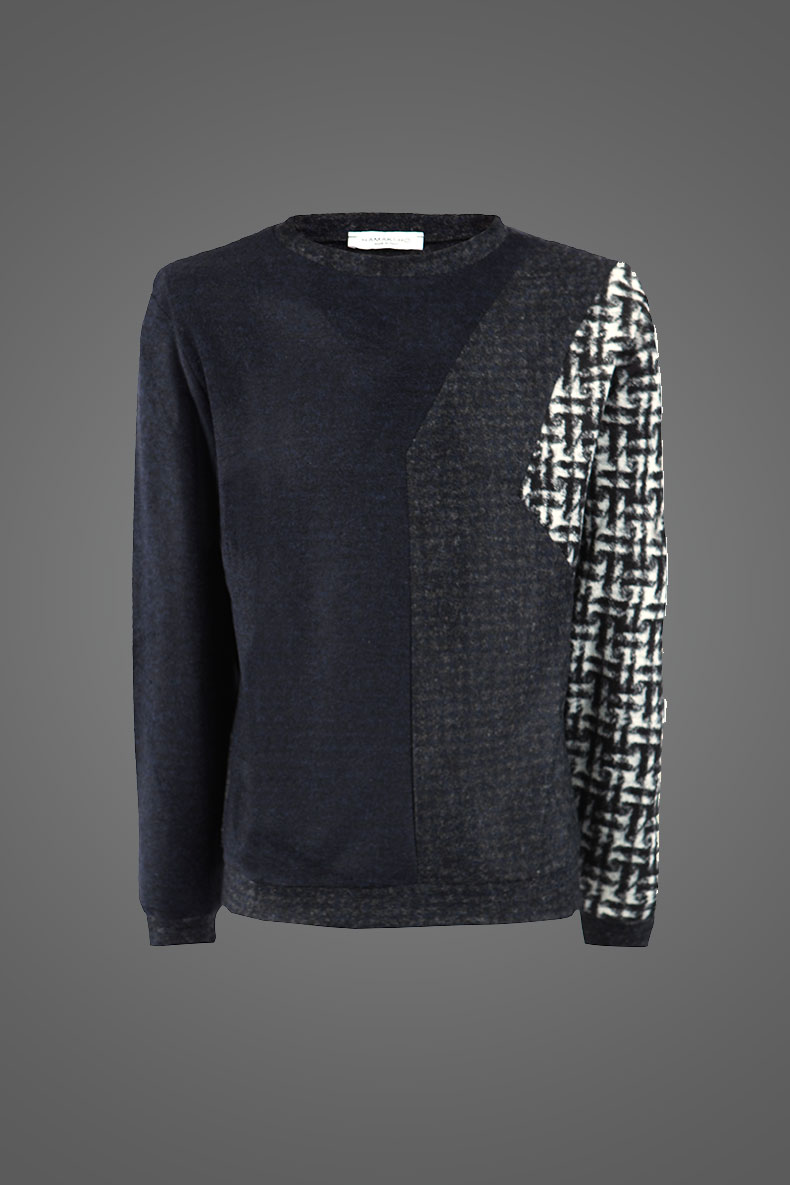 Felpa girocollo, manica lunga, divisa in tre tessuti blu grigio e lungo la manica pied de poule bianco e nero.