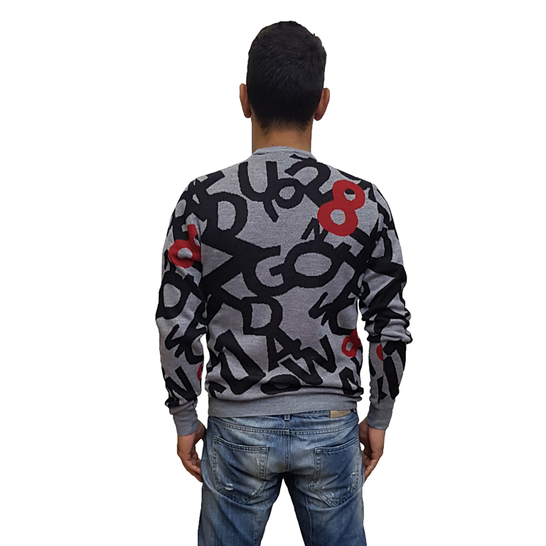 Maglia girocollo, manica lunga, grigio chiaro, interamente stampata con lettere e numeri a contrasto. Made in Italy.