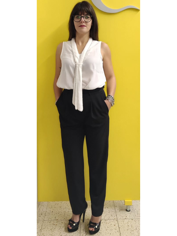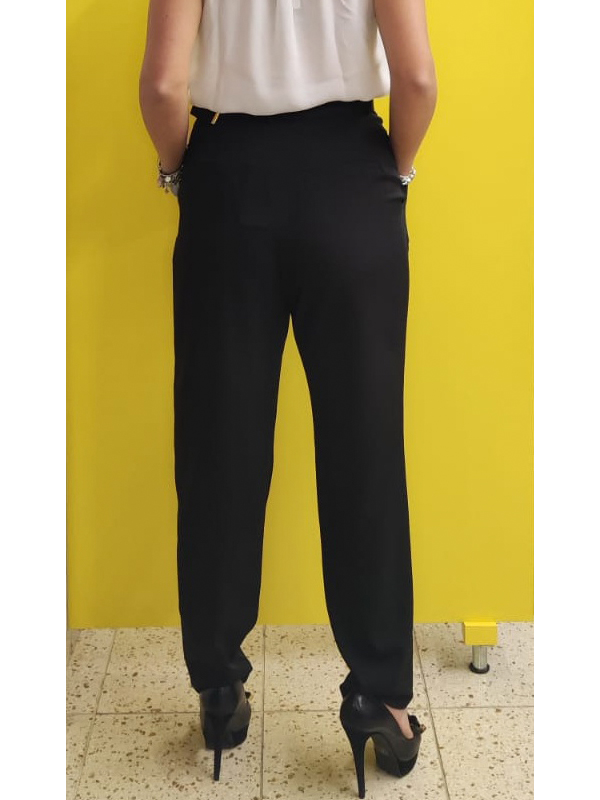Pantalone nero, vita alta, tasche a filo laterali, tessuto fluido, cinta in dotazione con dettaglio gioiello.