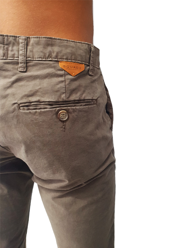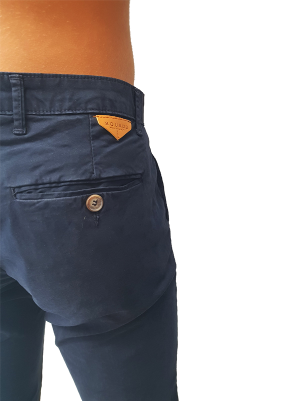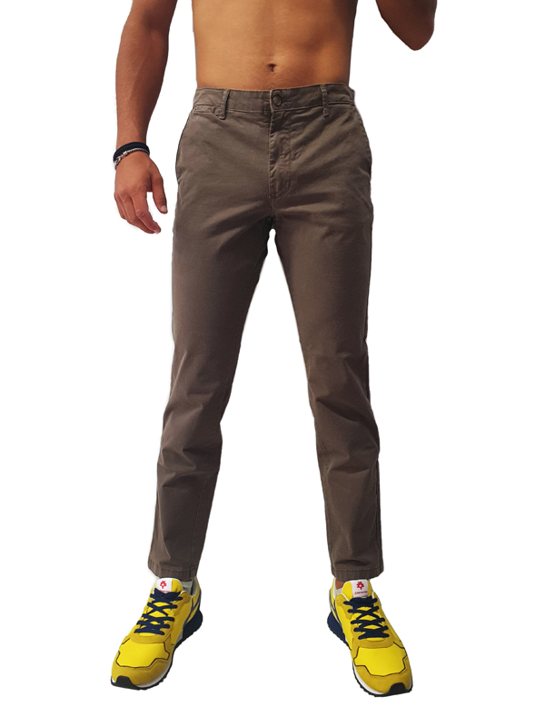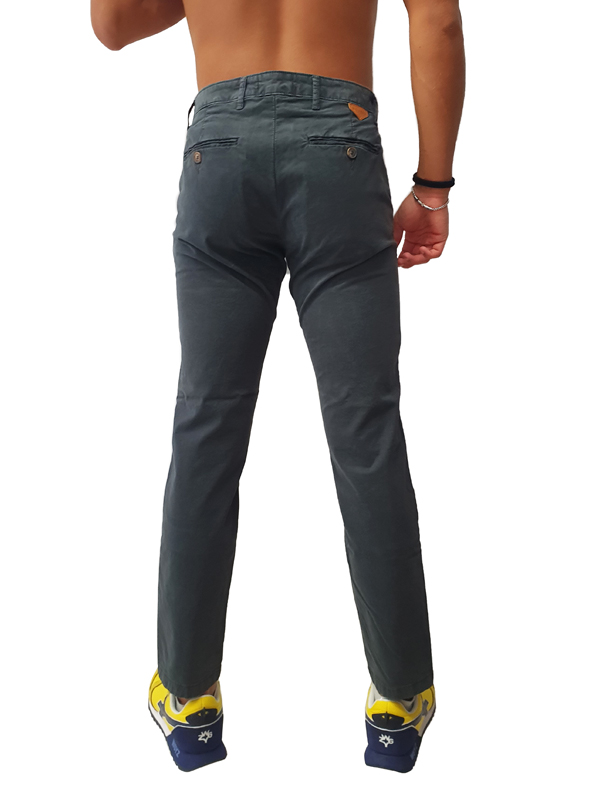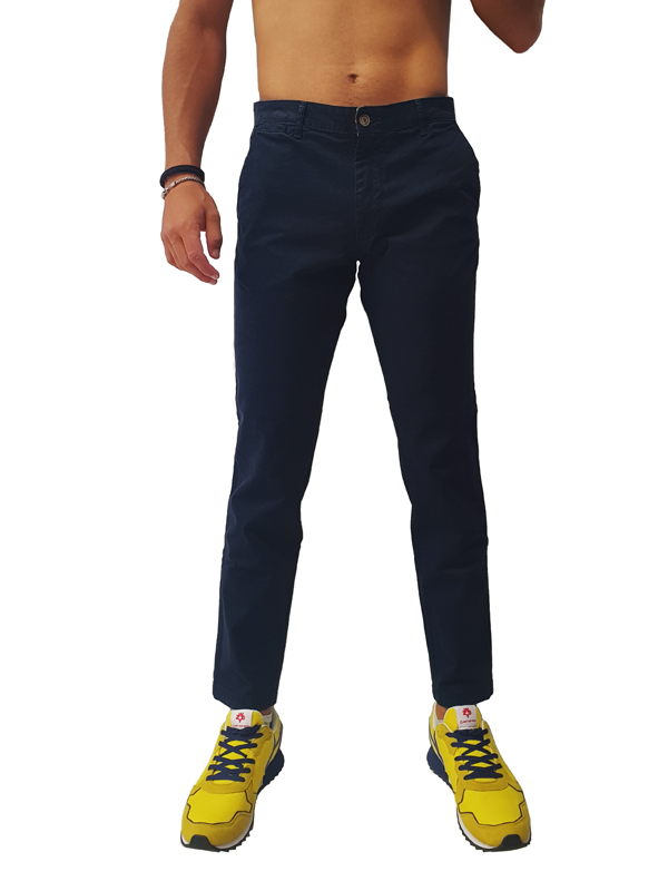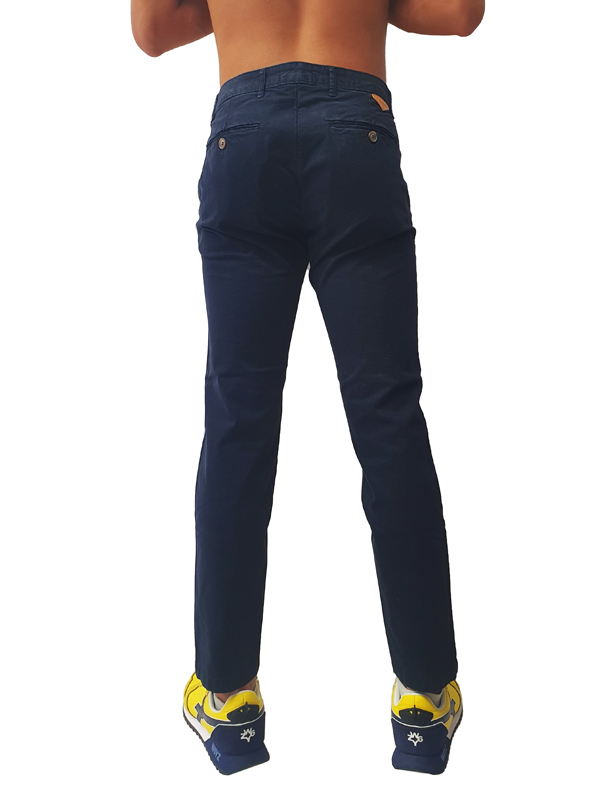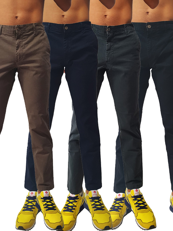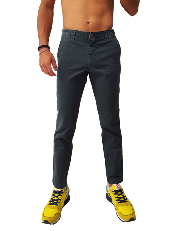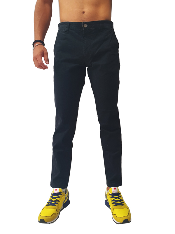 Pantalone di cotone con tasche laterali a filo, tasche a filo sul retro con chiusura tramite bottone, vestibilità skinny fit, disponibile in diverse varianti di colore, chiusura centrale tramite zip e bottone.