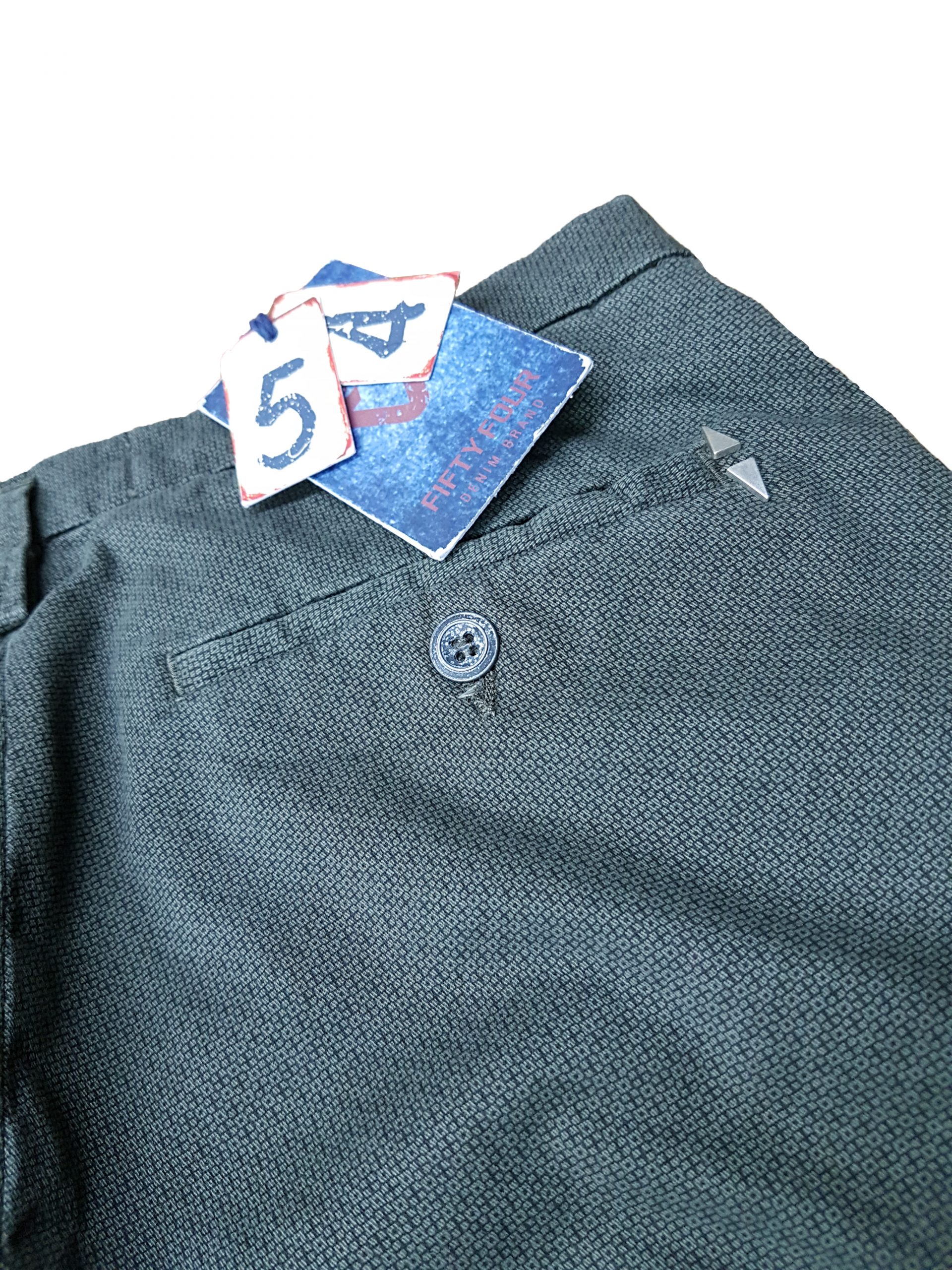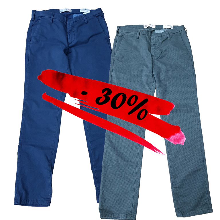 Pantalone skinny fit, tasche a filo, chiusura centrale tramite zip e bottone, miscrofantasia, disponibile in due diversi colori blu scuro o verde militare. Made in Italy.