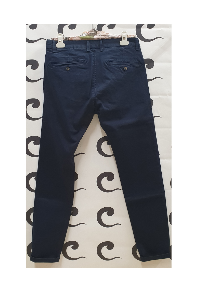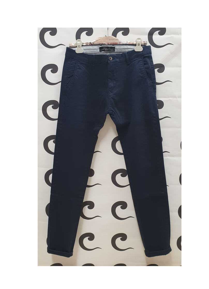 Pantalone blu, tasche laterali a filo, chiusura centrale tramite zip e bottone, vestibilità regolare.