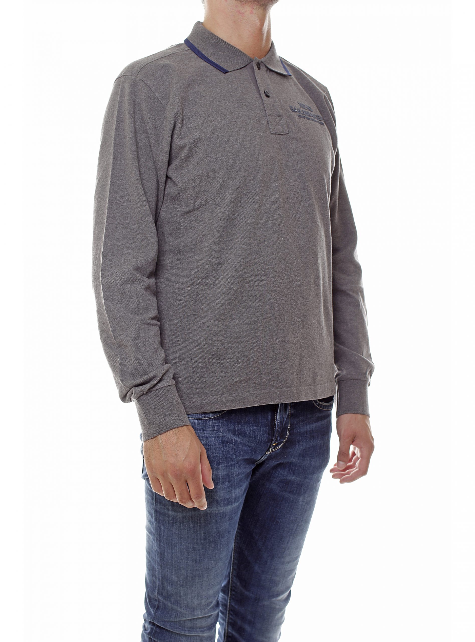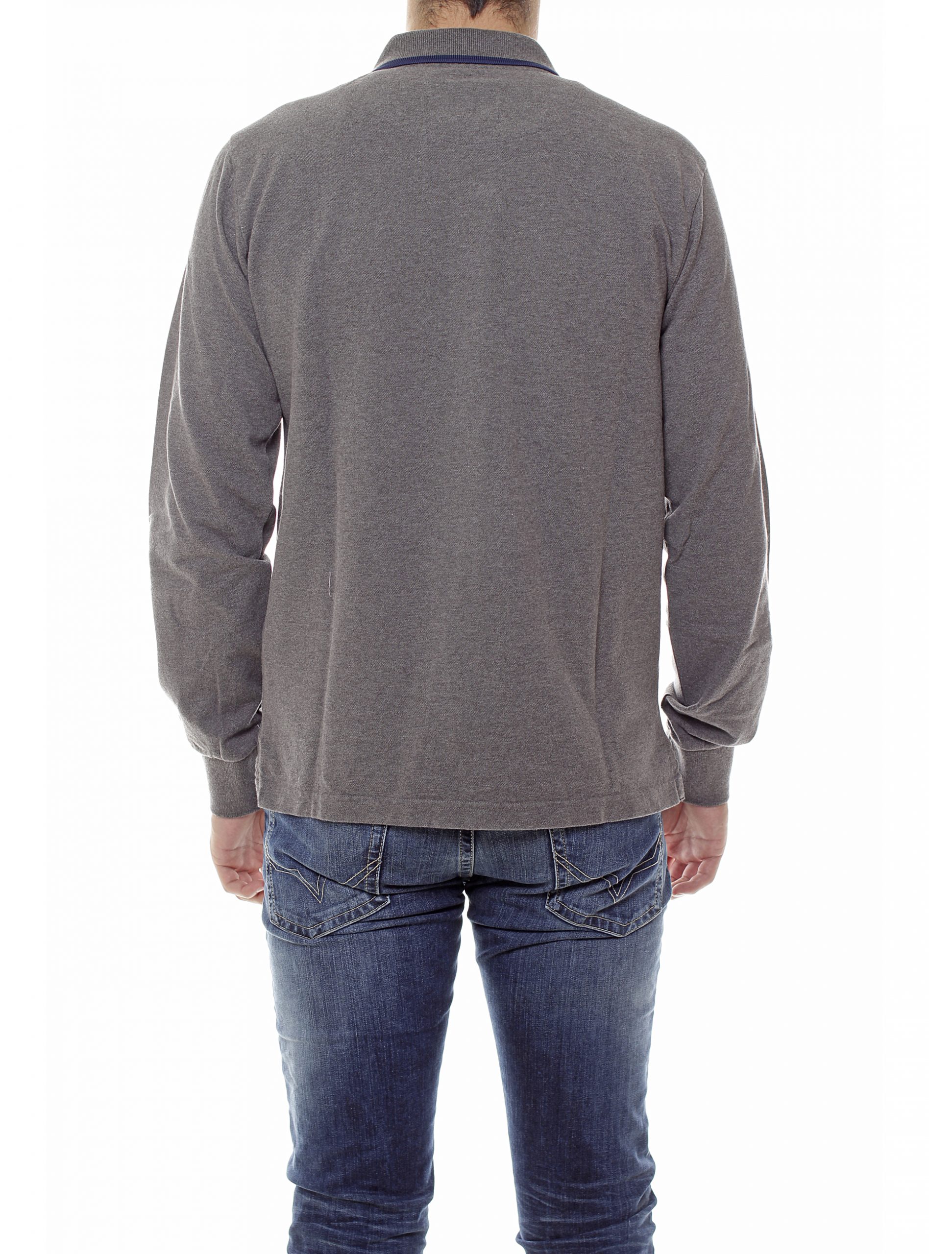 Polo manica lunga grigio scuro, bordino collo blu, 2 bottoni, spacchetti laterali, logo sul petto.