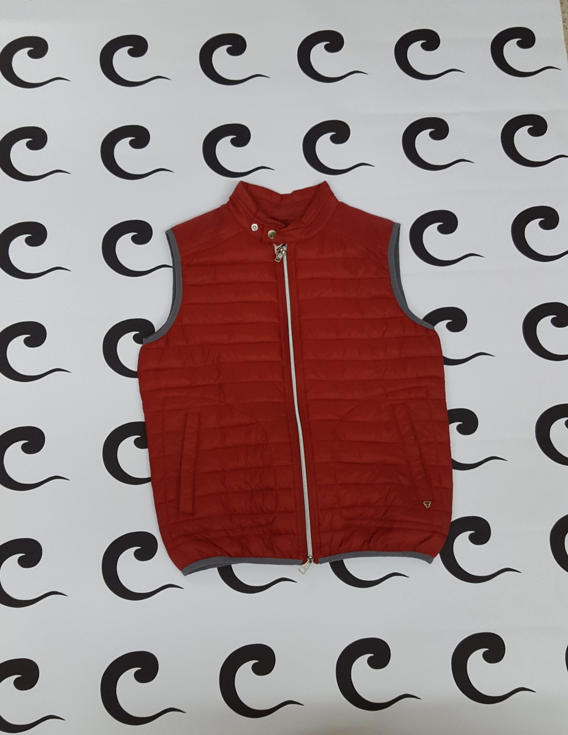 Smanicato, disponibile in due varianti di colore azzurro o rosso, chiusura centrale tramite zip, tasche laterali con chiusura bottone clip.
