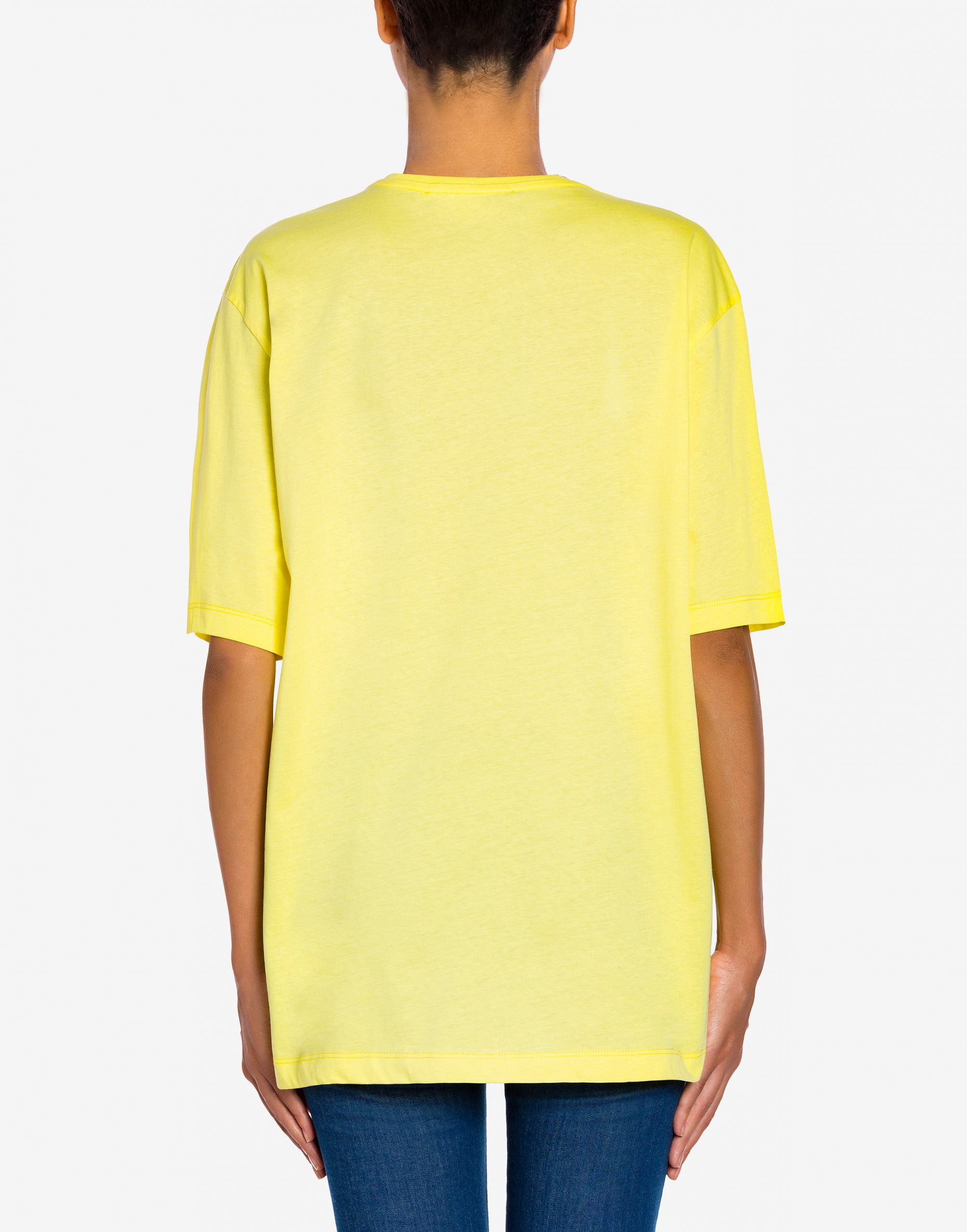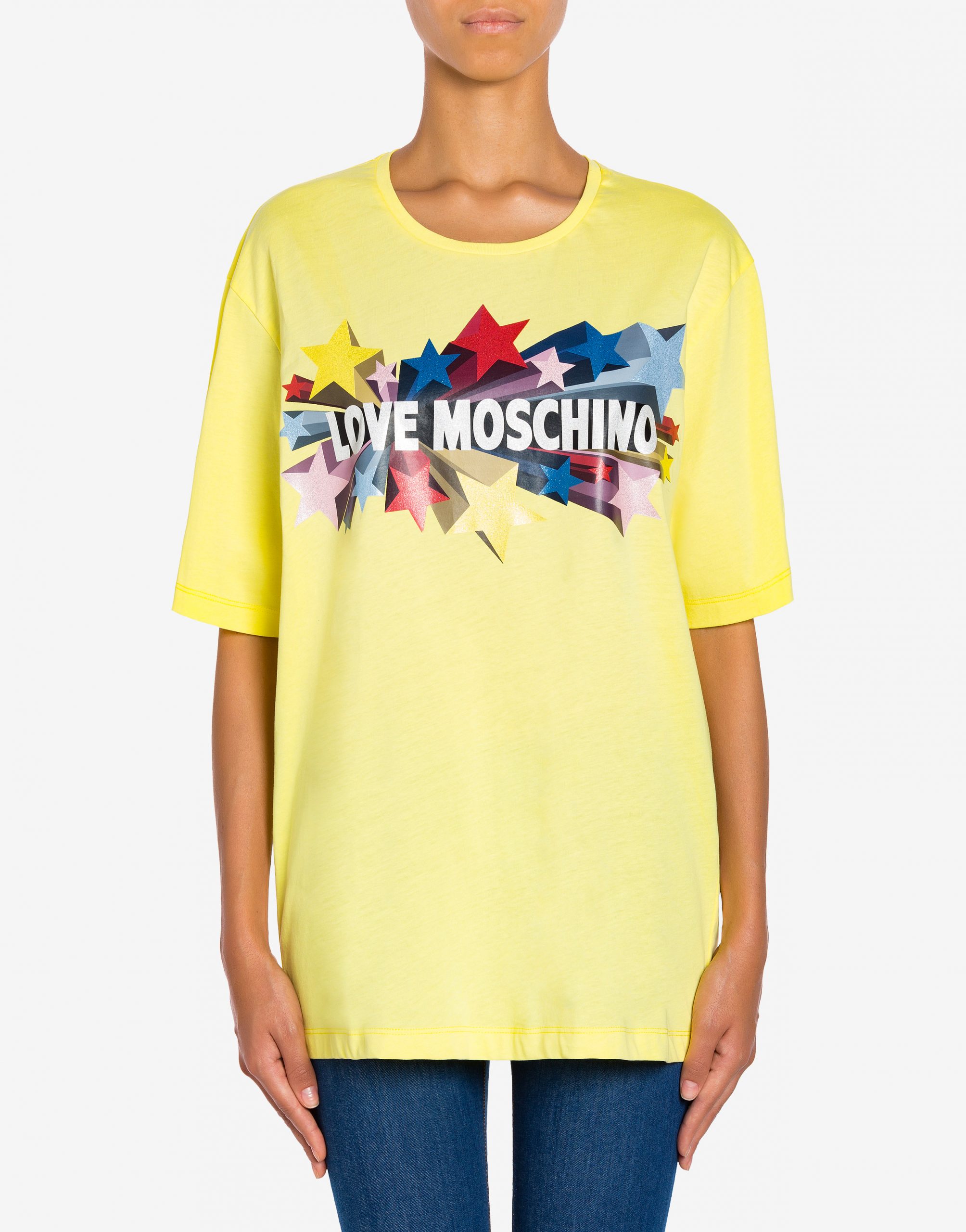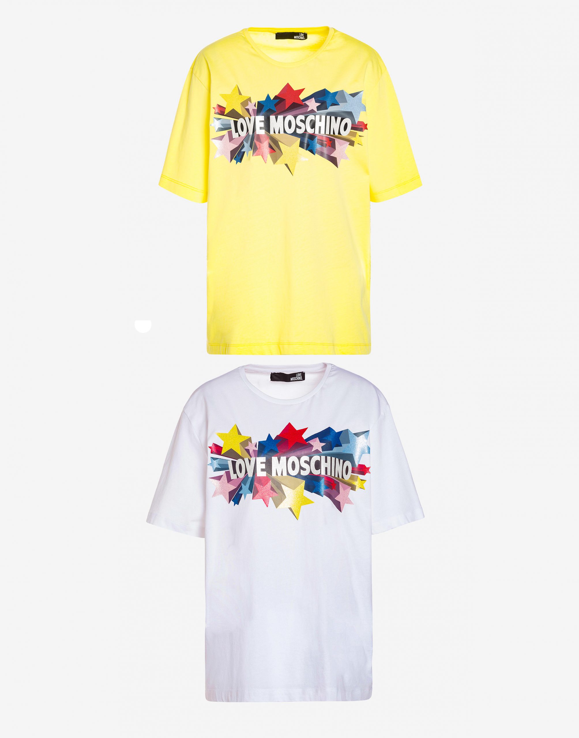 Maglia manica corta, girocollo, disponibile in due varianti di colore bianco e giallo, stampa logo sul davanti con stelle glitter, vestibilità regolare.