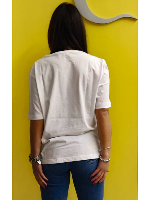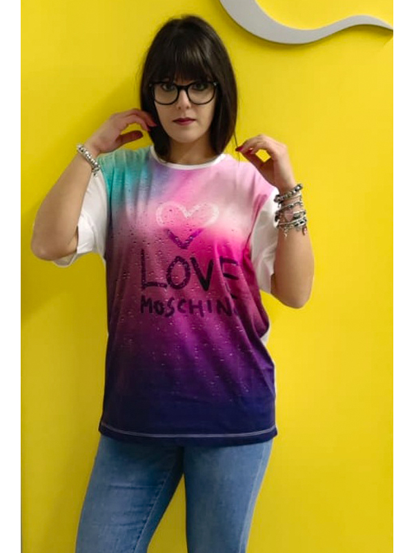 Maglia manica corta, girocollo, interamente stampata sul davanti, vestibilità over size.